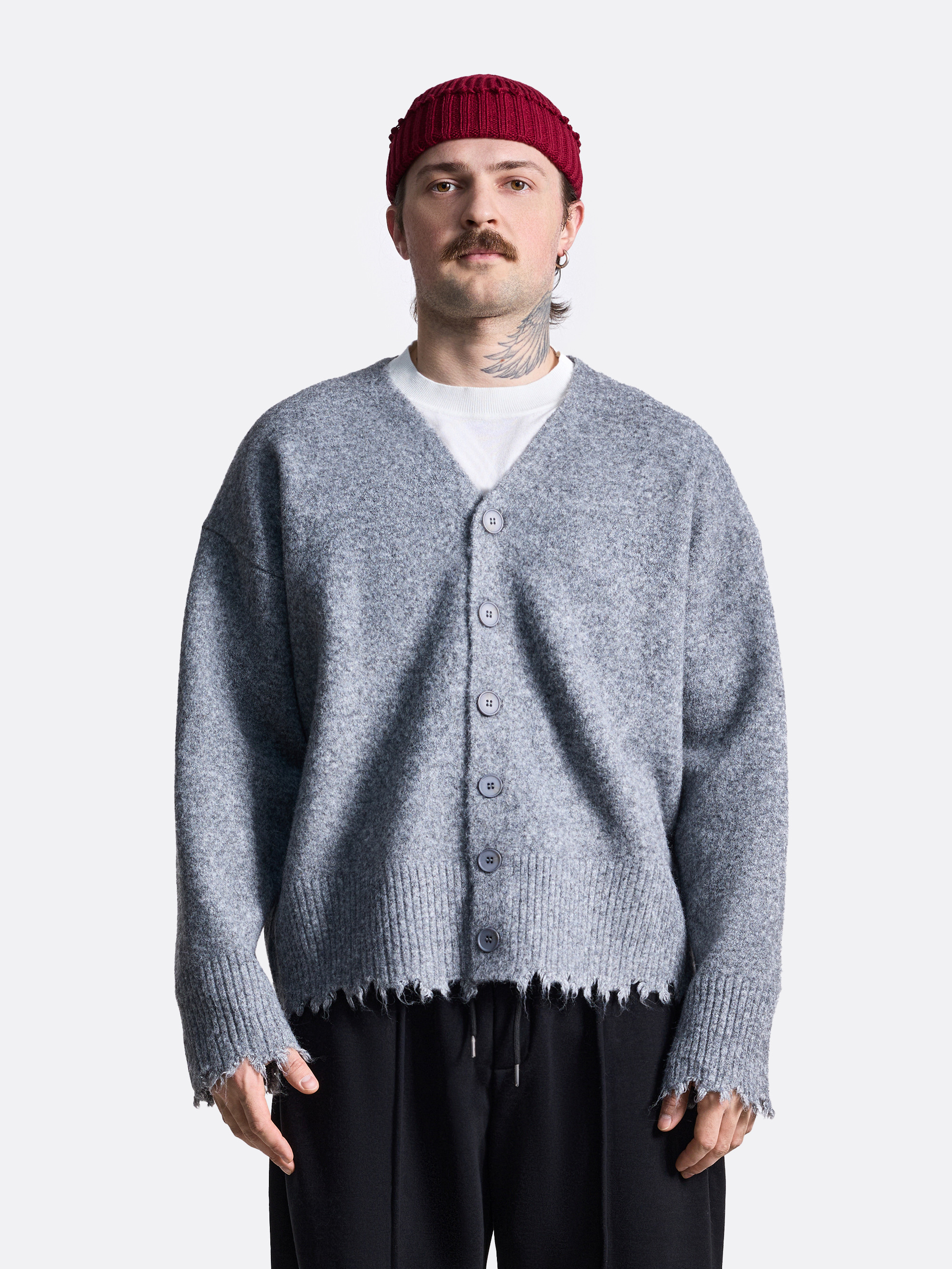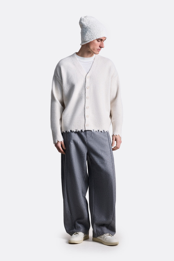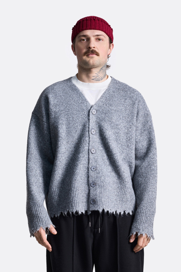 Вязаный кардиган с необработанным краем свободного кроя с V-образным вырезом. Застёгивается на пуговицы, выполнен из мягкой пряжи, приятной на ощупь. Особенность модели — слегка потрёпанные края по низу и на манжетах, что придаёт стильный неформальный акцент. Отлично подойдёт для прохладных дней — можно носить поверх футболки или свитера. Универсальный вариант для повседневных образов. Кардиган представлен в сером и молочном цветах.