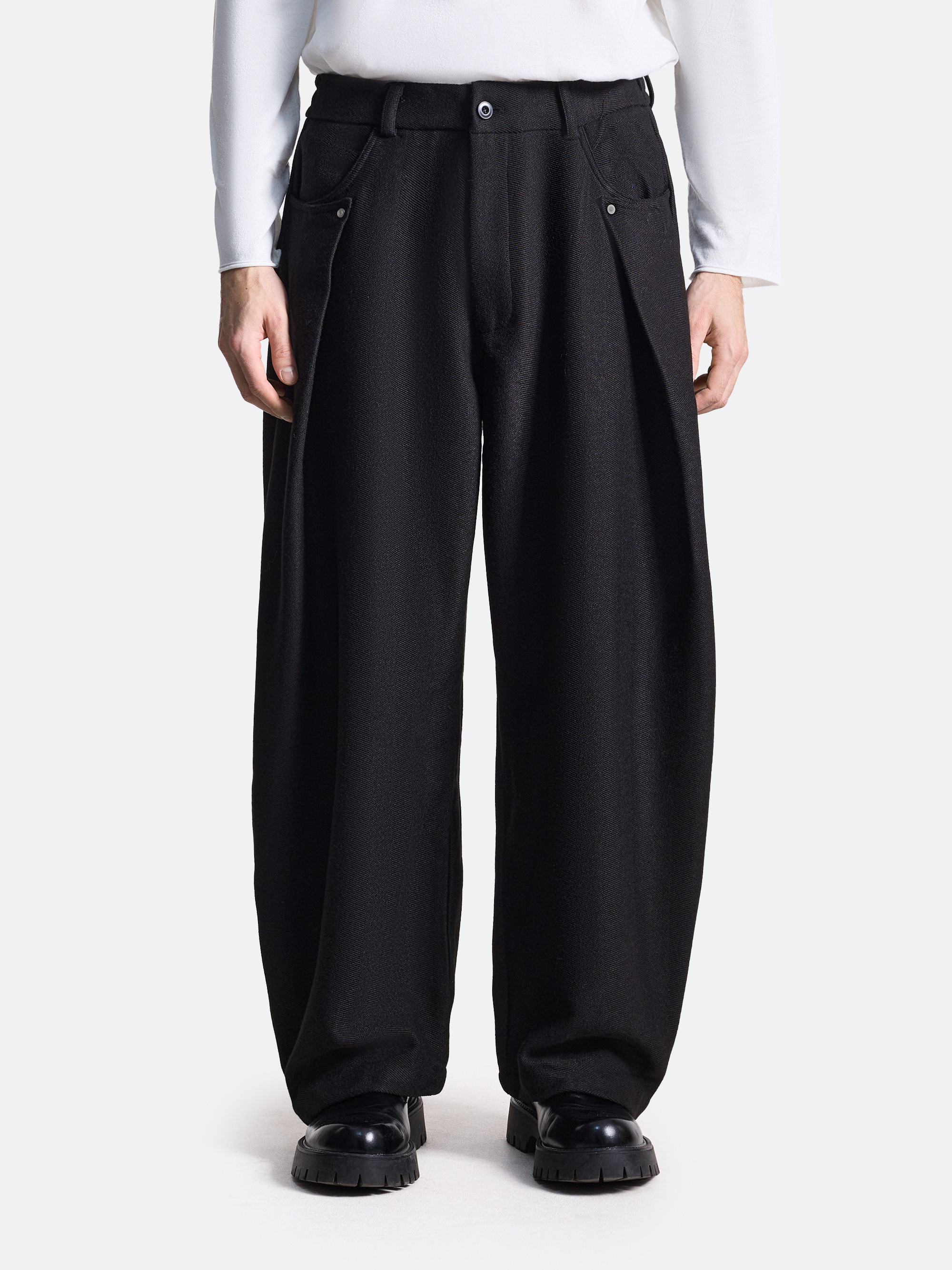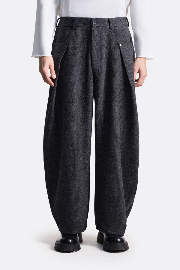 Широкие брюки с защипами. Средняя посадка, широкие брючины, декоративные элементы на карманах с металлическими заклёпками придают изделию стильный акцент. Плотный материал с добавлением шерсти хорошо держит форму. Брюки легко комбинируются с базовыми классическими рубашками, лонгсливами или футболками. Модель представлена в сером и черном цветах.