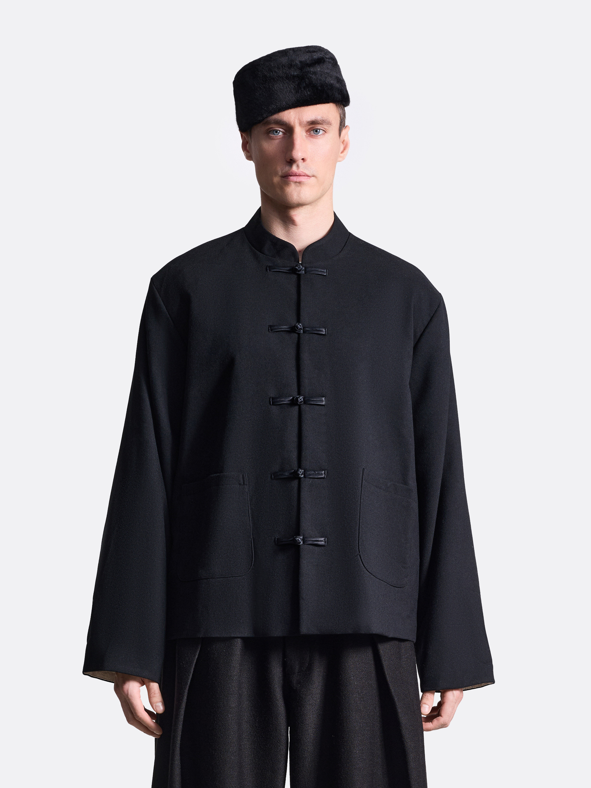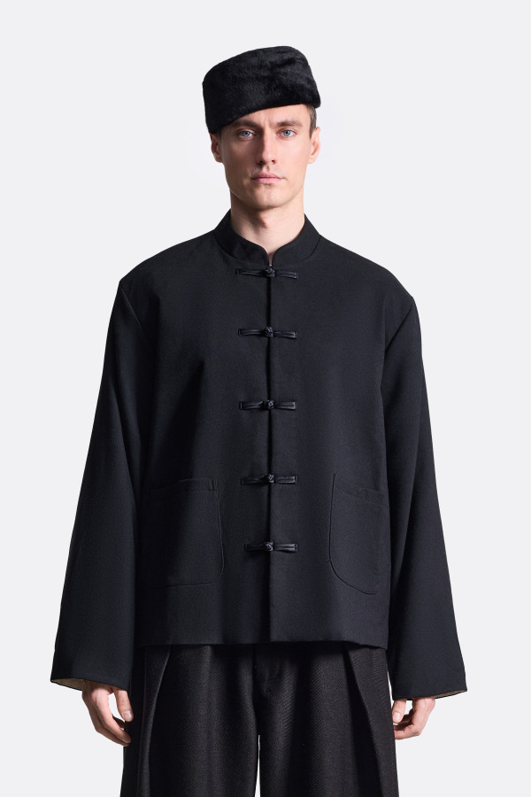 Кимоно с воротником-стойкой и застёжками-клевант. Свободный крой, длинные рукава и накладные карманы делают эту модель одновременно стильной и практичной. Идеально подойдёт для ценителей этнической эстетики или тематических образов. Классический чёрный цвет легко сочетается с другими элементами гардероба.