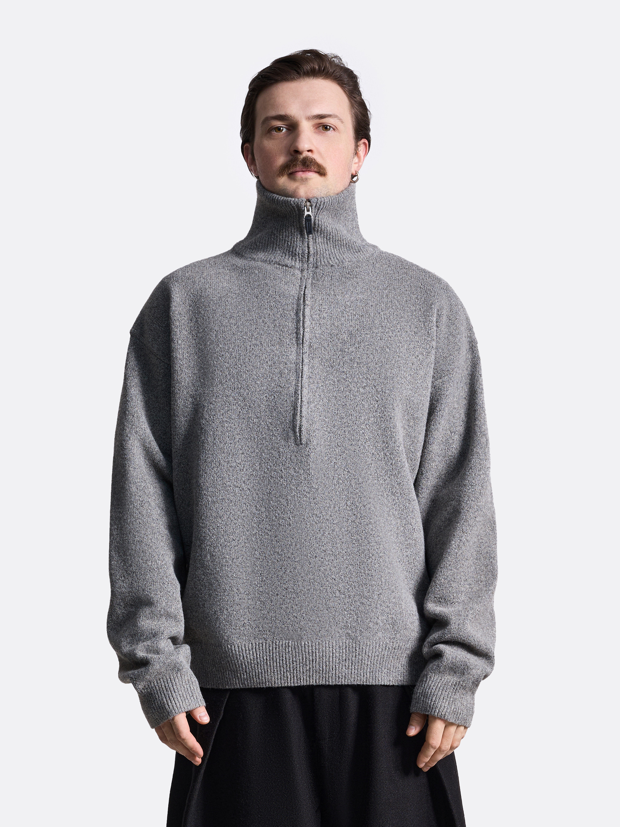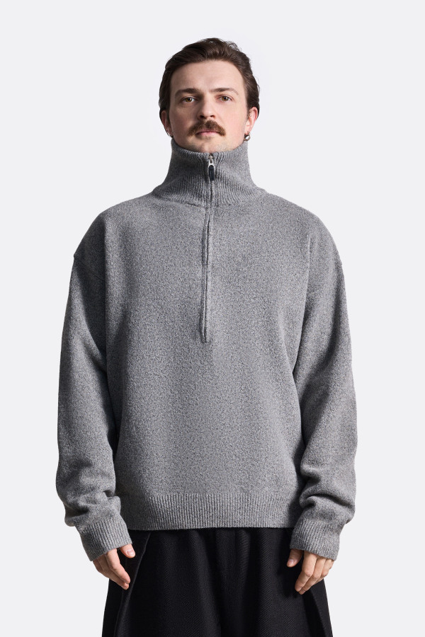 Свитер свободного кроя с высоким воротником и застёжкой-молнией. Длинные рукава, глубокий регулируемый молнией вырез и лаконичный дизайн. Эластичная резинка по краю рукавов и низу. Практичный вариант для прохладной погоды и для многослойных образов: можно носить поверх футболки или базовой водолазки. Свитер представлен в коричневом и сером цветах.