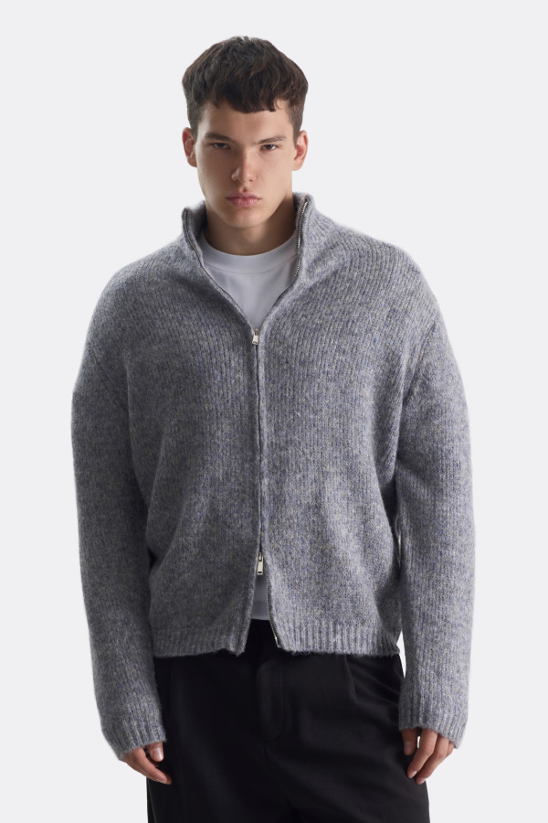 Светло-серый свитер на молнии с высоким воротом. Мягкий объём, расслабленная посадка, неброская меланжевая текстура. Выполнен из мягкой пряжи, приятной на ощупь. Двусторонняя молния добавляет удобства, а воротник можно носить как поднятым, так и отложенным.