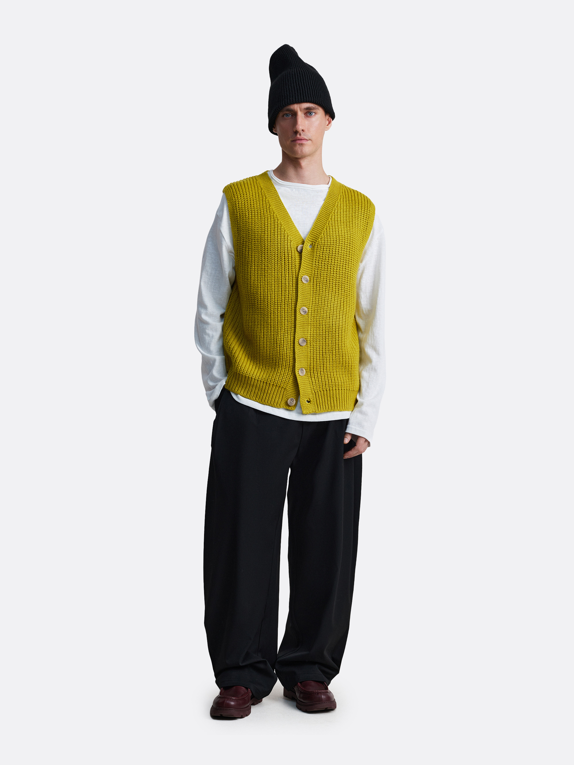 Объёмная вязаная жилетка с крупной фактурной петлей. Акцент на плотную вертикаль вязки, деревянные пуговицы и слегка удлинённый силуэт. Материал на основе шерсти мягкий и упругий — держит форму, но не лишён пластики.