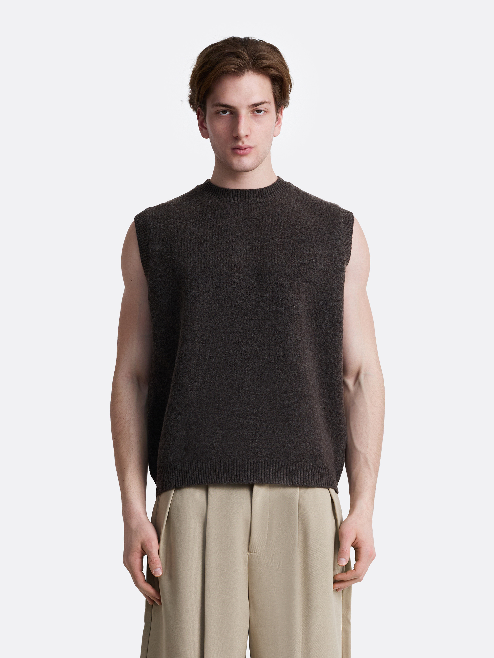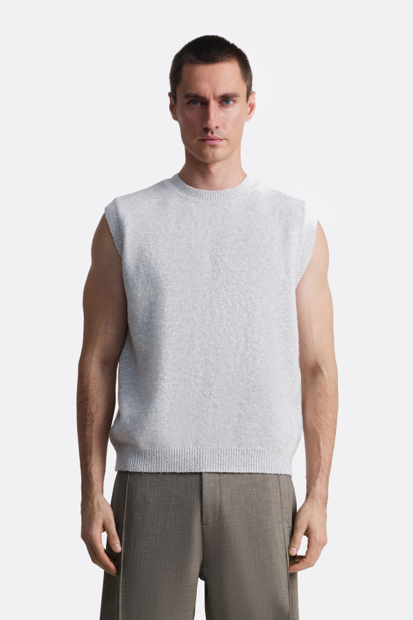 Минималистичный вязаный жилет из плотного материала с добавлением шерсти — лаконичный, но выразительный. Без лишних деталей, с акцентом на форму и текстуру: высокий круглый вырез, ровный низ, аккуратная резинка по краям. Матовая пряжа с едва заметным меланжевым эффектом придаёт жилету глубину, а свободный крой делает его универсальным слоем — самостоятельным или в паре с базой.