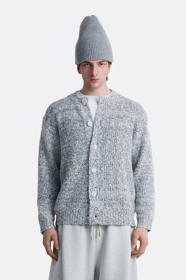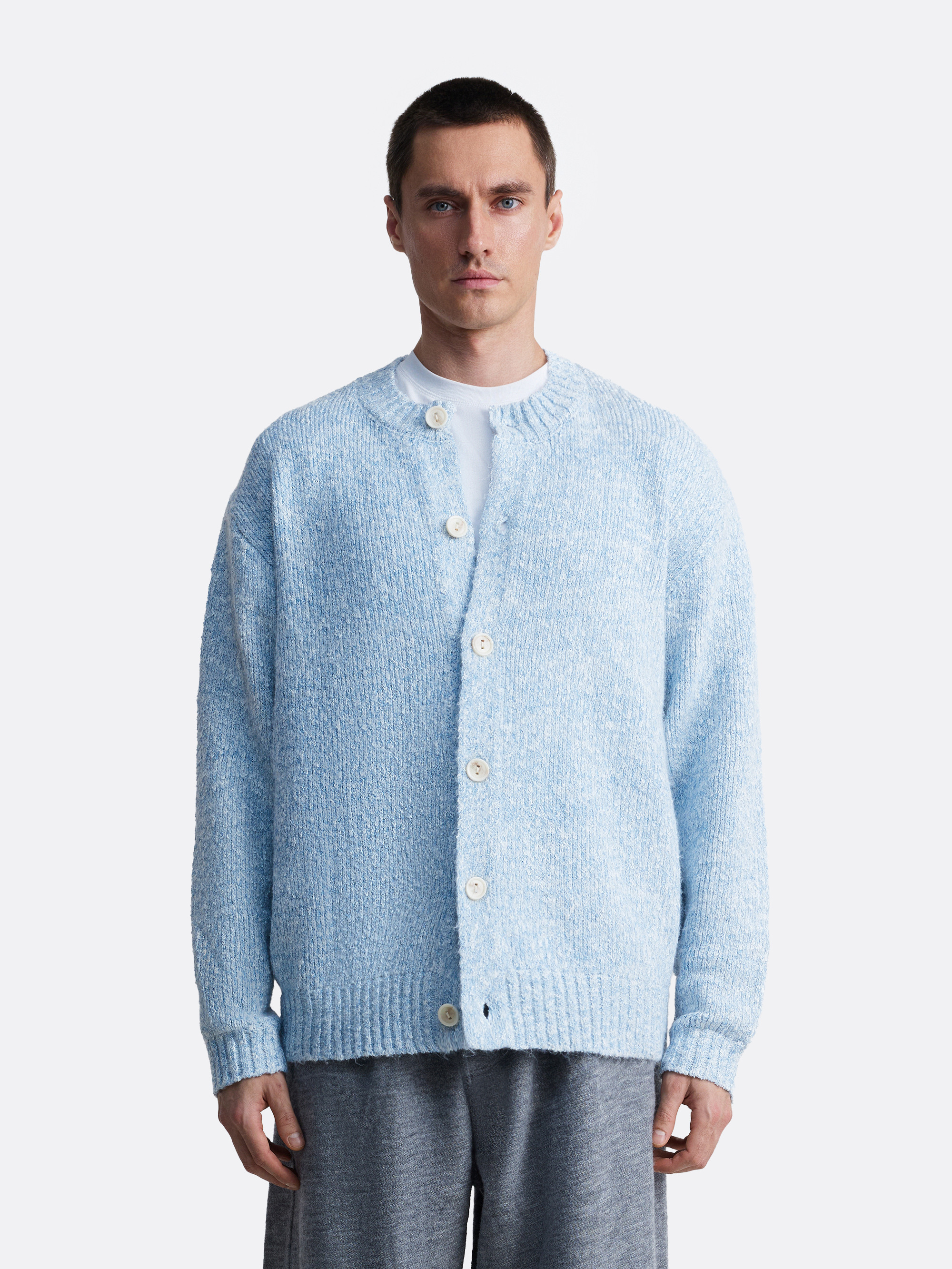 Вязаный кардиган мягкого со слегка рыхлой, «облачной» фактурой, создающей ощущение невесомости и комфорта. Свободный силуэт, крупные светлые пуговицы и уплотнённая резинка по краю добавляют аккуратную структуру, не забирая у вещи её расслабленного характера. Тактильно объёмный и уютный, легко вписывающийся в повседневные образы, привнося в них лёгкость.