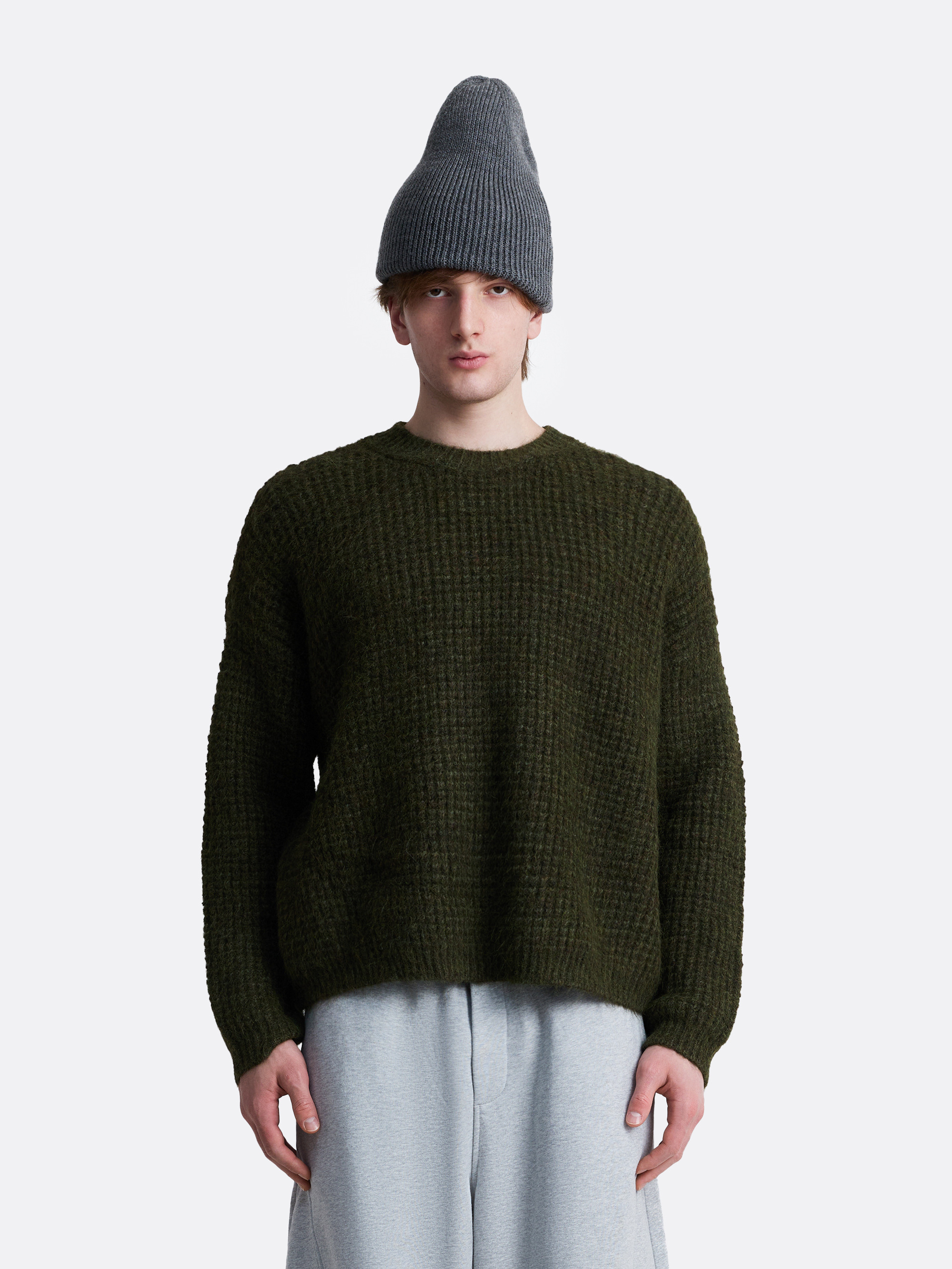Свитер свободного силуэта с акцентной фактурной вязкой в мелкую ячейку. Прямой крой без утяжеления, мягкая линия плеча, аккуратная горловина с плотной обвязкой. Подол и манжеты оформлены эластичной резинкой, которая держит форму и подчёркивает структуру изделия. Материал мягкий, с визуальным эффектом лёгкой пушистости и приглушённой матовой текстурой. Посадка расслабленная, без жёсткой геометрии.