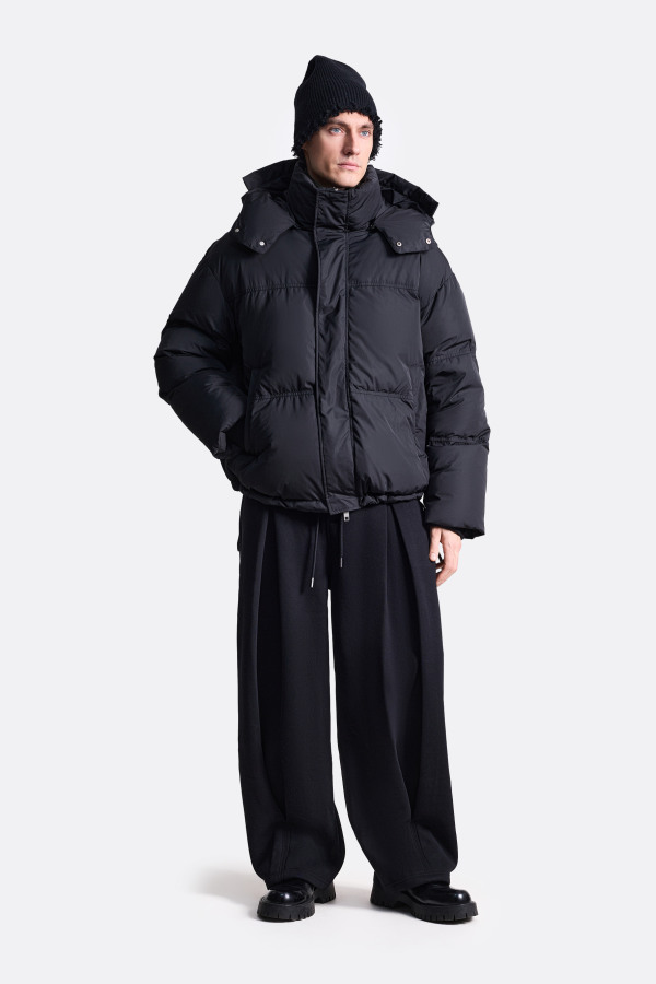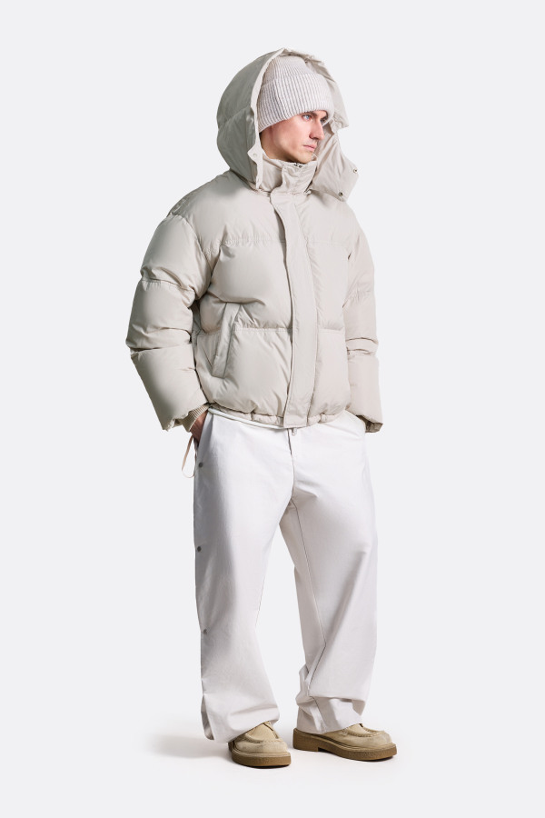 Зимний пуховик оверсайз-силуэта. Акцентная стёганая текстура с крупными сегментами, высокий утеплённый воротник-стойка, плавно переходящий в объёмный интегрированный съемный капюшон с мини козырьком. Центральная застёжка на молнии скрыта под планкой, которая фиксируется на кнопки. Трикотажные манжеты держатся на запястье, предотвращая попадание холода. Снизу пуховик дополнен скрытой кулиской, которая делает модель максимально адаптированной и многогранной. За счет нее куртку возможно регулировать в длине и объеме. Пуховик выполнен из мягкого нейлона, отталкивает влагу и не пропускает холодный ветер. В качестве утеплителя здесь использована смесь из натурального утиного пуха и пера.