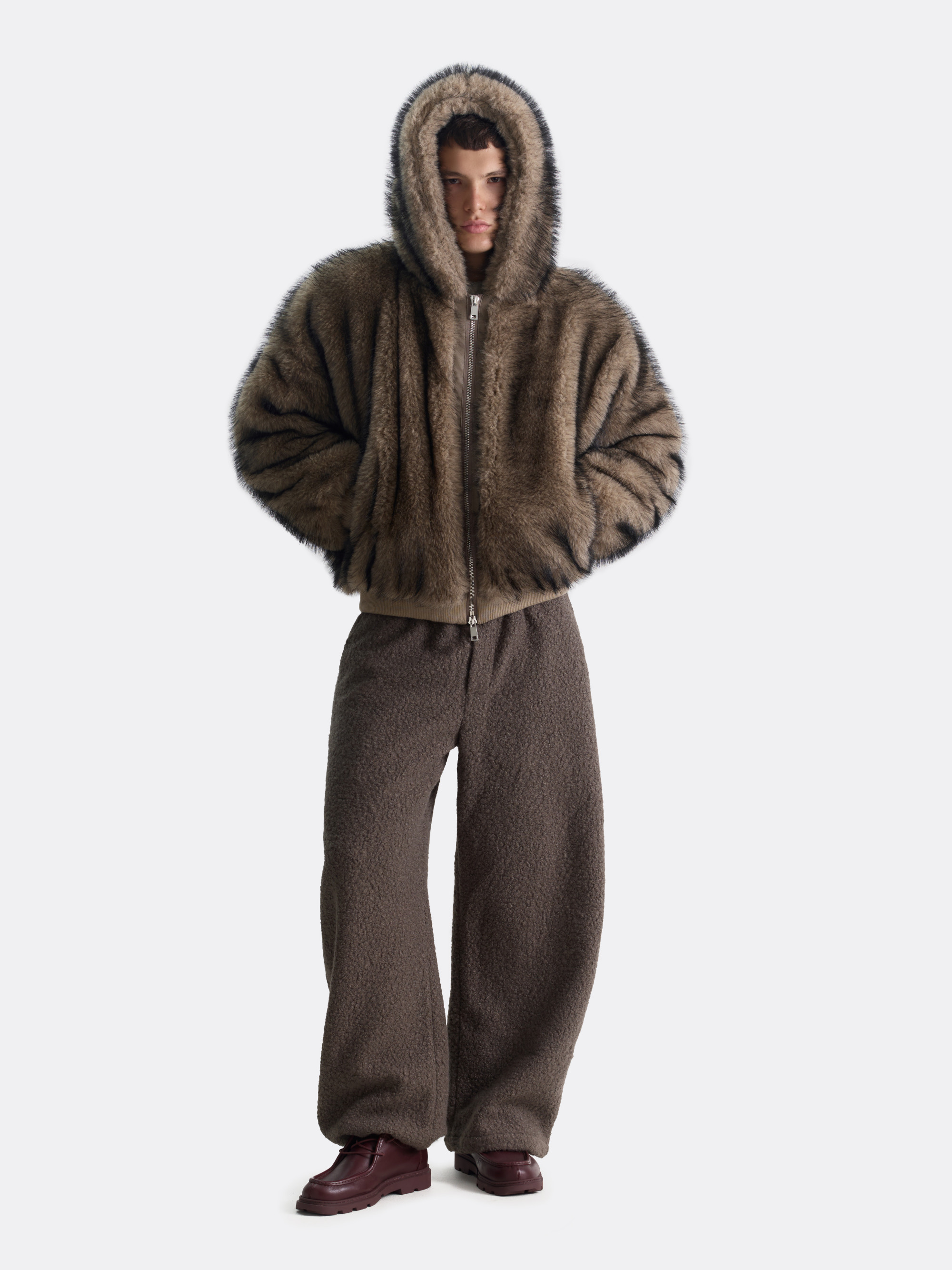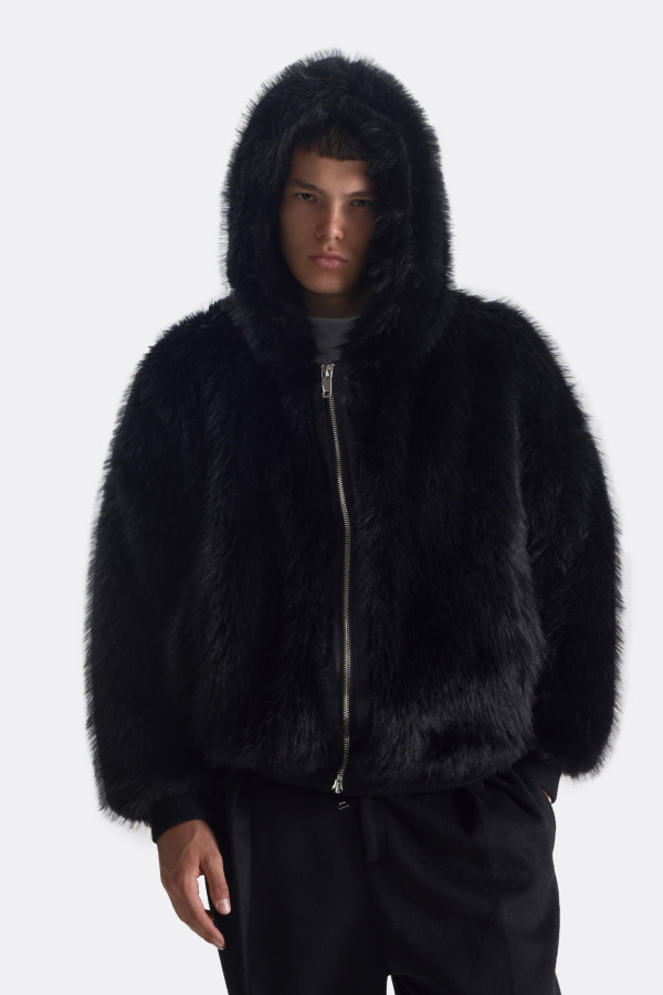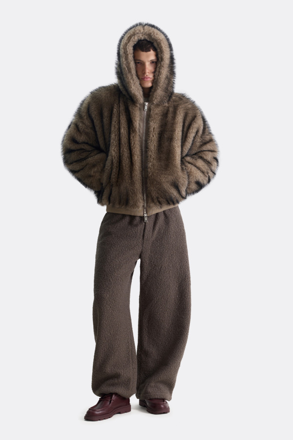 Объёмная шуба на молнии с глубоким капюшоном и мягким мехом под соболя. Бархатистая текстура и благородный тон создают ощущение уюта и лёгкой экстравагантности. Детали — резинка по низу и манжетам — придают образу цельность и аккуратную посадку.
