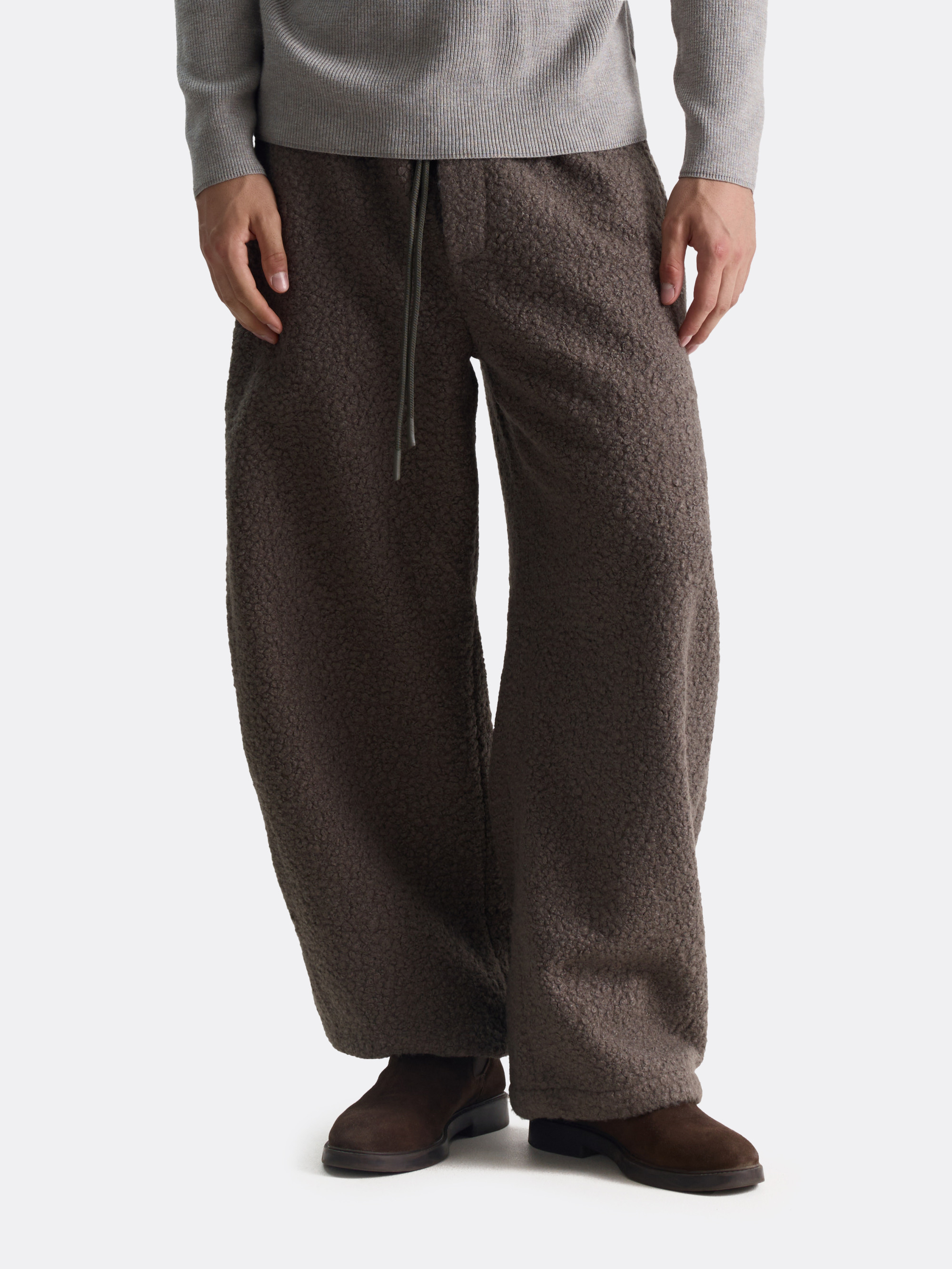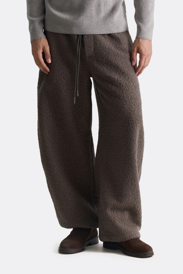 Широкие оверсайз брюки объёмного фактурного материала с мягкой шерстяной поверхностью. Свободный крой с прямыми штанинами, со средней посадкой и длинным шнурком на поясе. Ткань с выразительной текстурой teddy-эффекта — визуально объёмная и комфортная на ощупь. Спинка без лишних деталей.