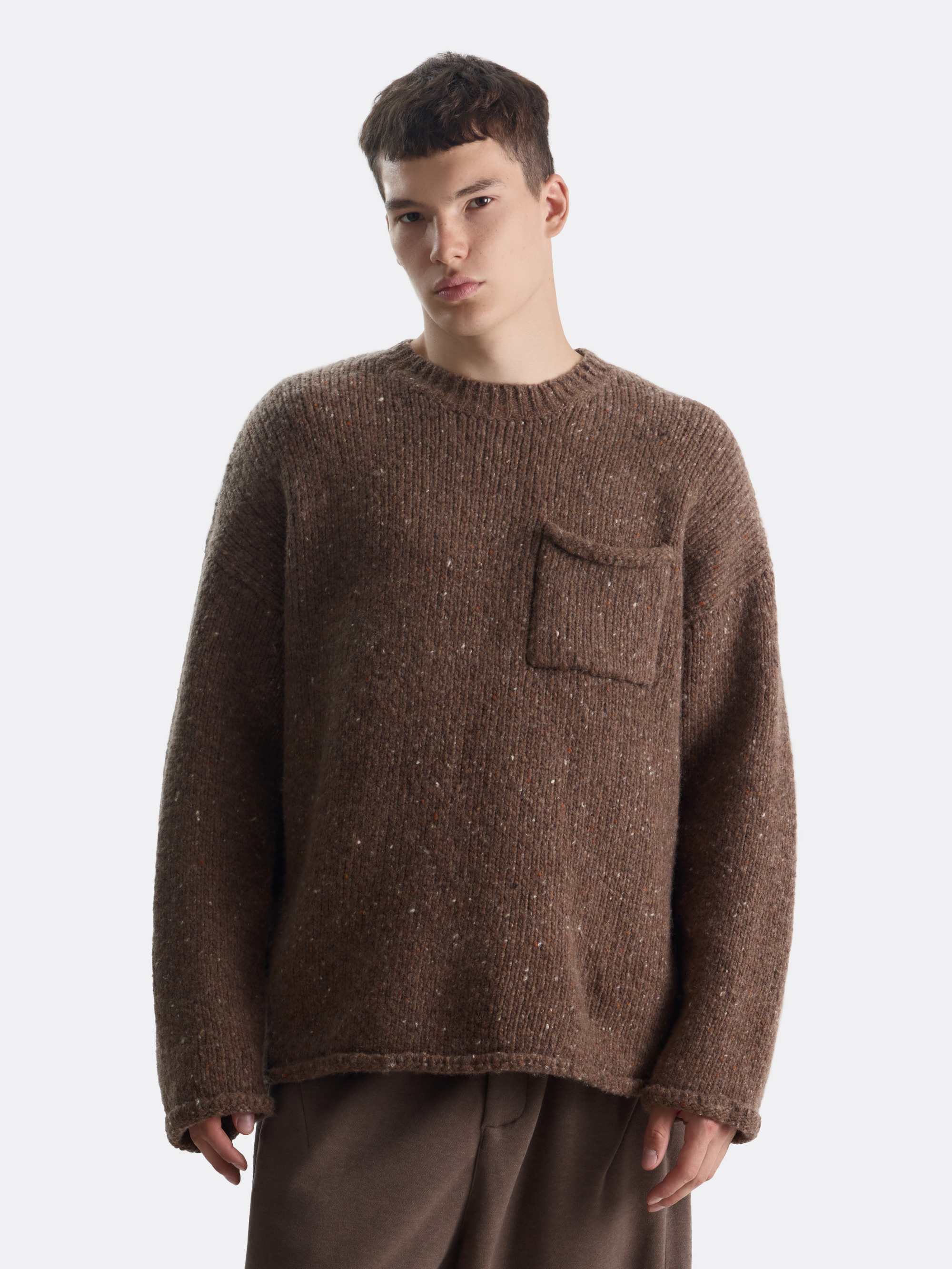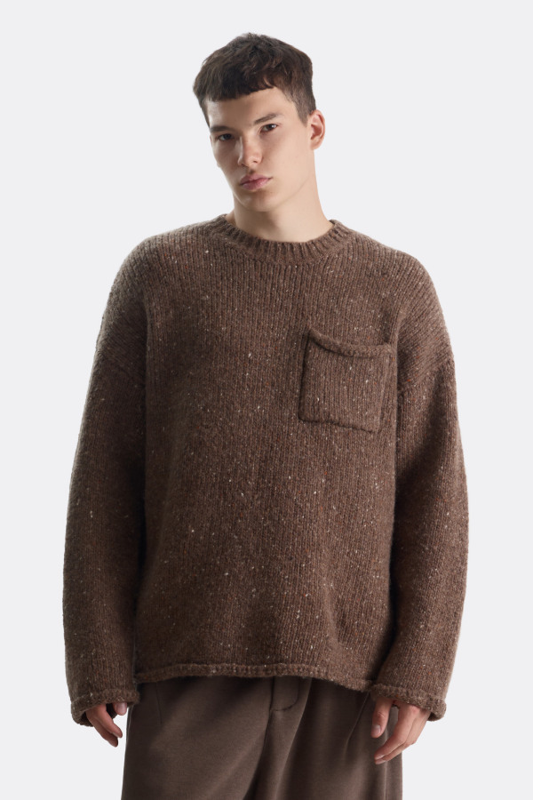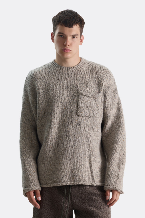 Свитер с выраженной фактурной вязкой из шерсти и спокойным меланжевым тоном. Небрежный край, чуть удлинённые рукава и один нагрудный карман — минимализм с характером. Свободный силуэт, округлая горловина, плотная и теплая вязка. Вещь вне времени — для тех, кто ценит уют и текстуру. Свитер оверсайз-кроя.