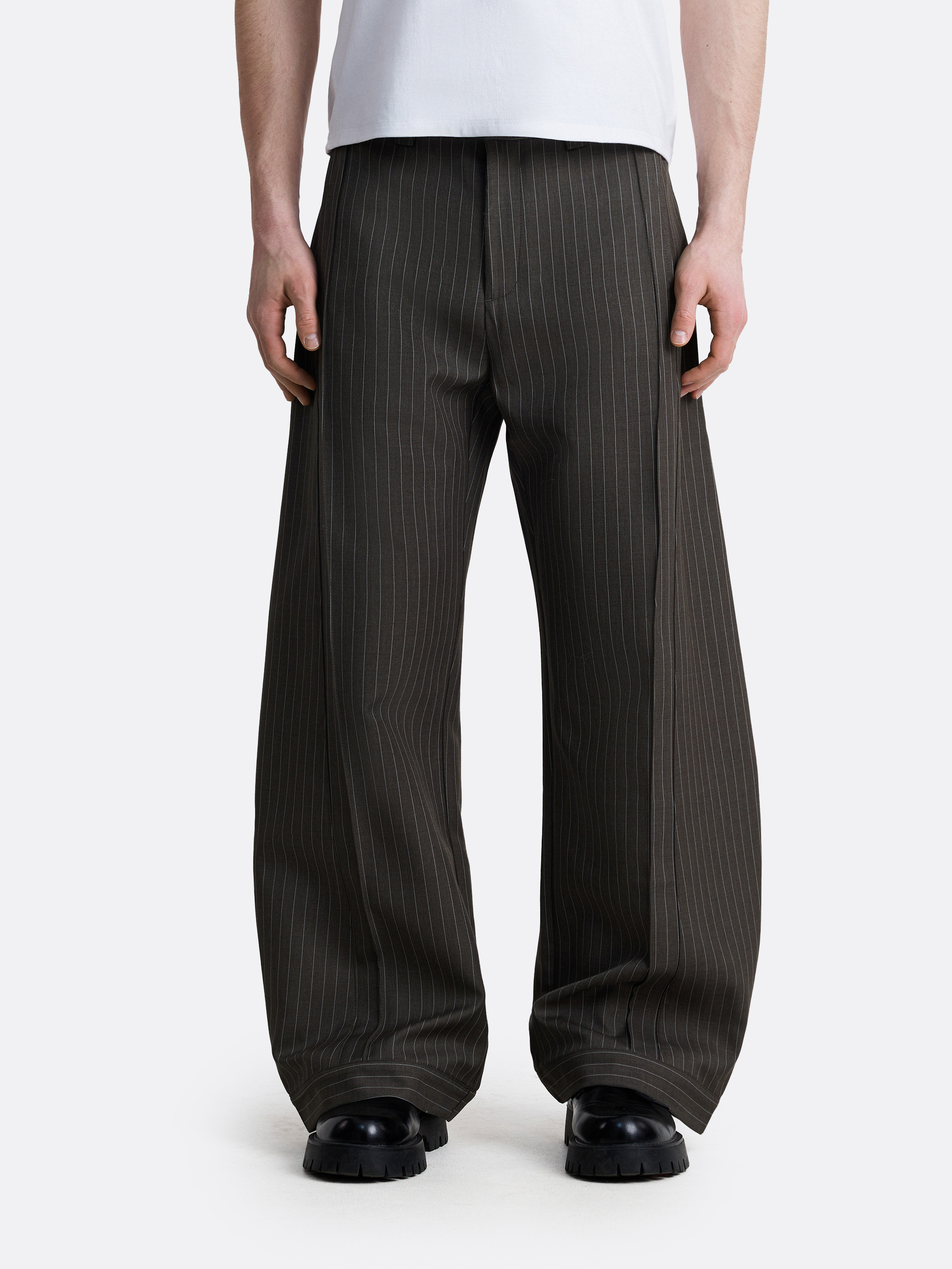 Свободные брюки с плавной, расслабленной посадкой и выраженной линией стрелок. Мягкая ткань с добавлением шерсти формирует естественный драп и подчёркивает объёмный силуэт. Пояс со шлёвками, аккуратная застёжка на пуговицу и продуманные детали кроя задают чистый, современный ритм.