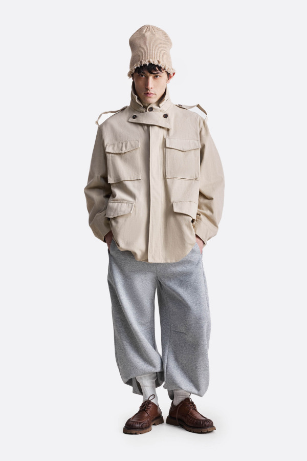 Куртка свободного кроя с акцентом на функциональные детали. Модель выполнена из плотного материала с выраженной текстурой, что придаёт ей структурный силуэт. Куртка дополнена четырьмя объёмными накладными карманами с клапанами, воротником-стойкой и застёжкой на пуговицы с ветрозащитной планкой. Универсальный силуэт и продуманные детали делают куртку практичной и актуальной для повседневного гардероба.