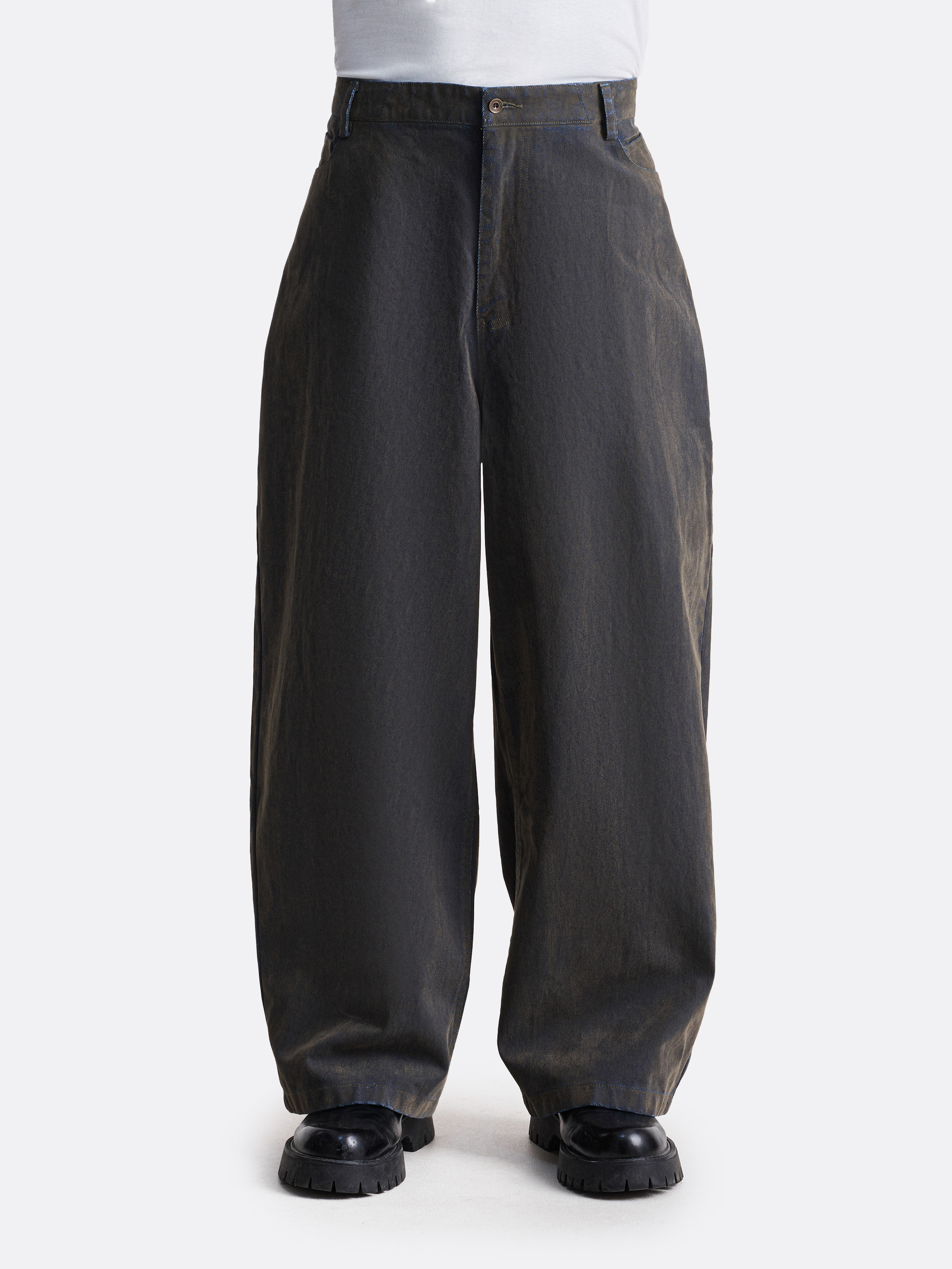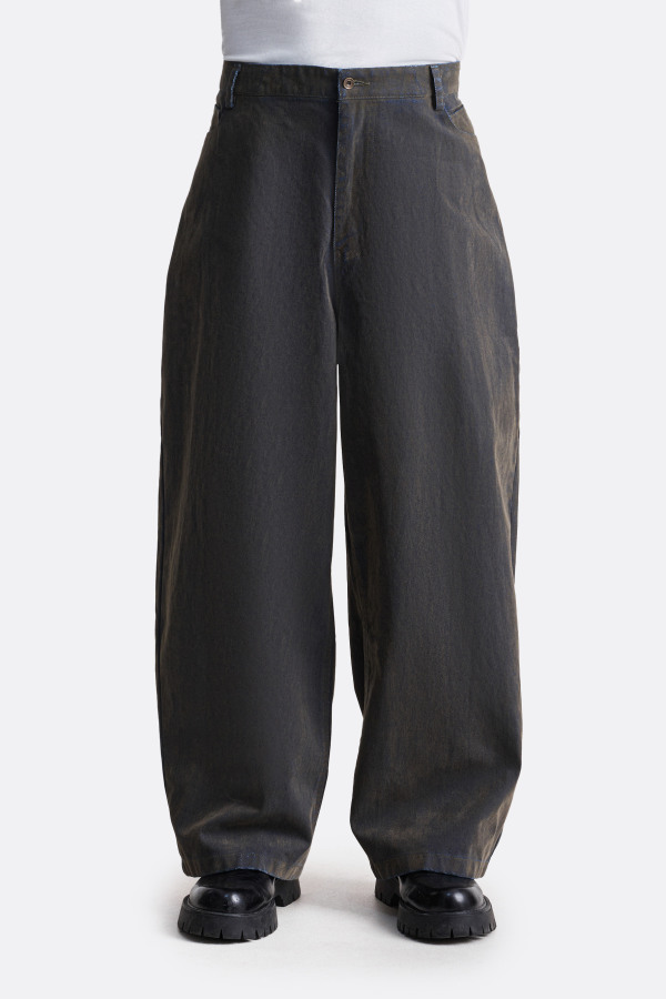 Джинсы из темно-зеленого денима высокой плотности с легким эффектом потертости. Брюки имеют классический пояс с шлевками для ремня и застежку на молнию и пуговицу.