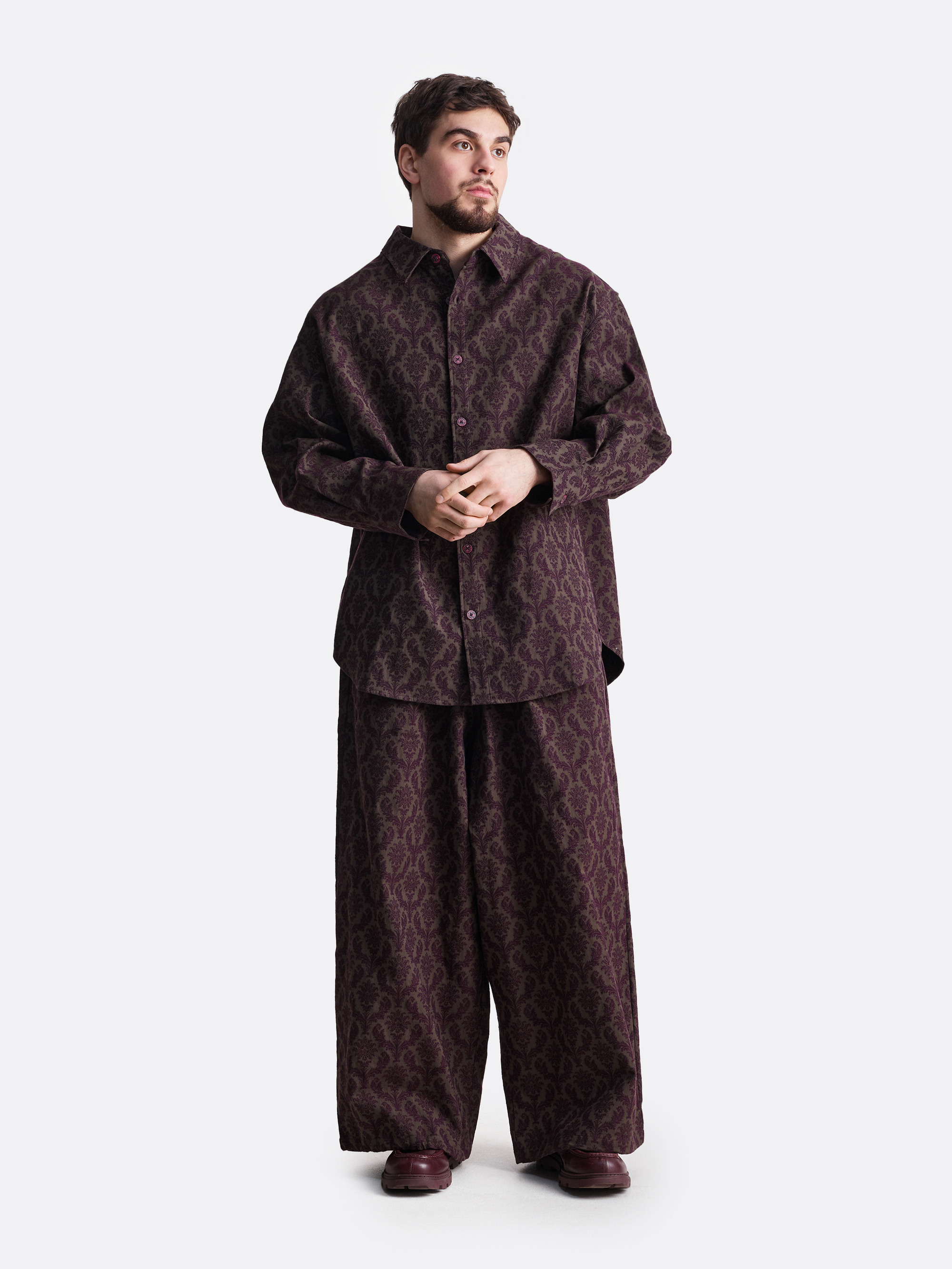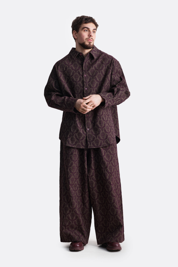 Рубашка бордового цвета с ярким узором. Модель имеет классический крой с длинными рукавами и воротником. Застежка на пуговицы, которая располагается по центру. Рубашка выглядит элегантно и подходит для повседневной носки или более формальных случаев.