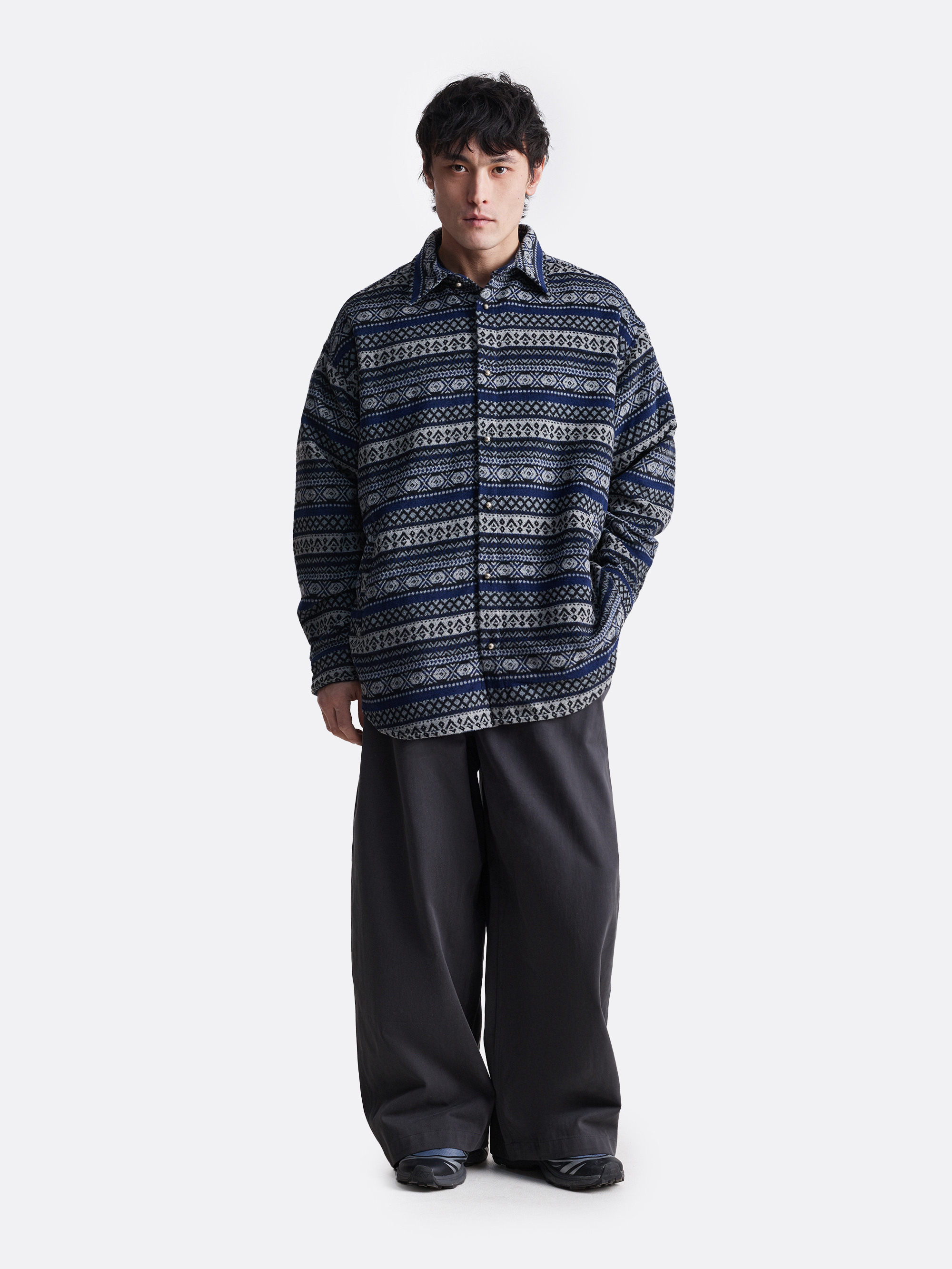 Свободная рубашка с традиционными узорами. Узор состоит из геометрических элементов, таких как ромбы, треугольники и круги, что придает рубашке этнический стиль. Рубашка имеет длинные рукава и воротник, застегивающийся на пуговицы.