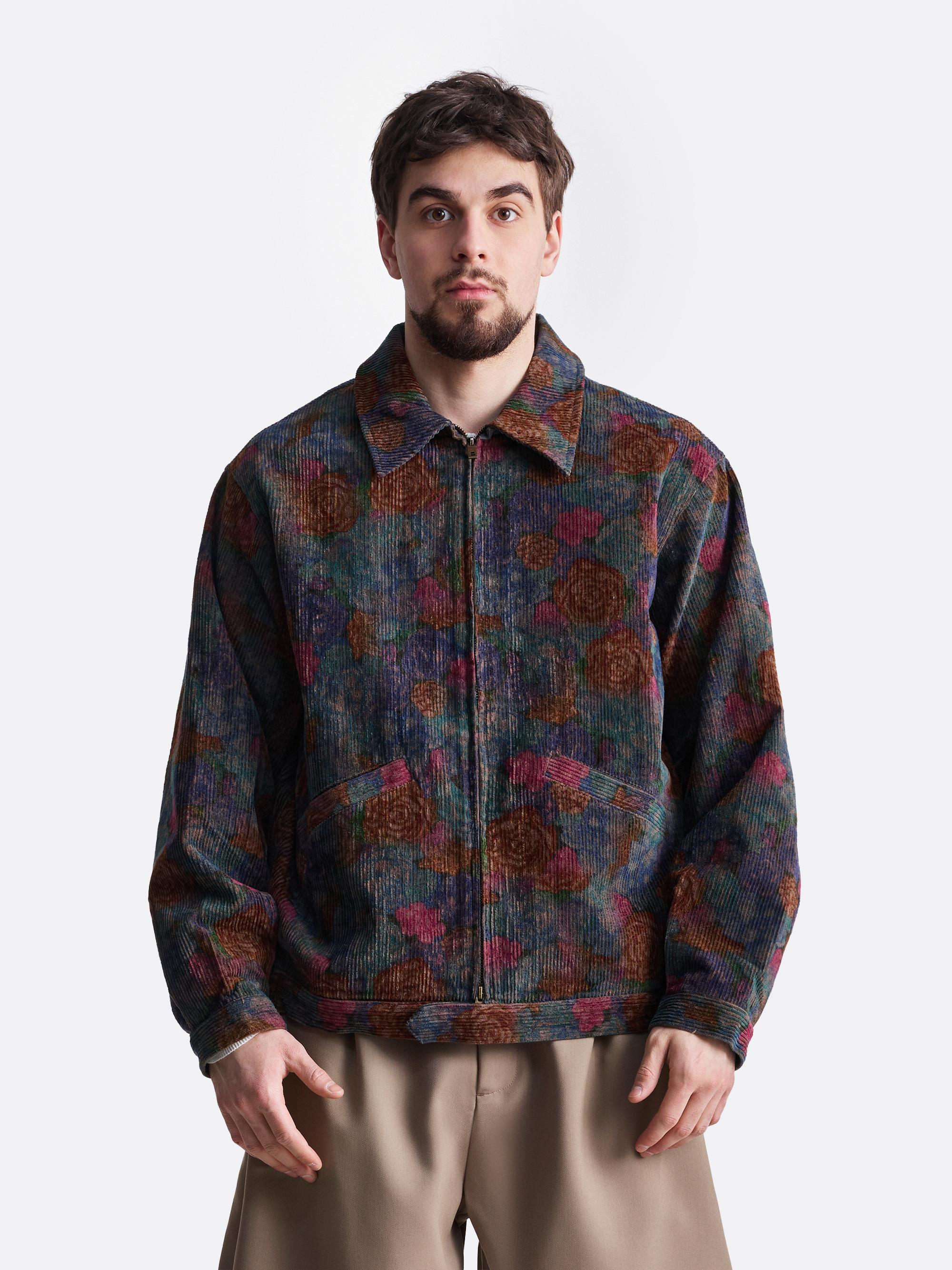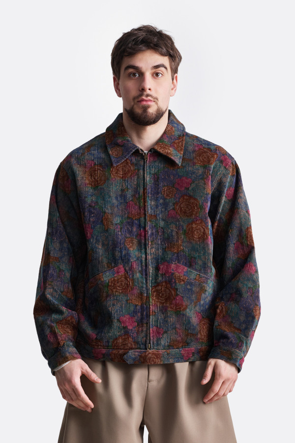 Вельветовая куртка с ярким цветочным принтом. Куртка имеет классический крой с длинными рукавами, накладными карманами и воротником-стойкой. Цветочный узор выполнен в теплых тонах, включая коричневый, розовый и зеленый, что придает изделию яркий вид. Вельветовая ткань придает куртке мягкость, а также делает ее стильным элементом гардероба.