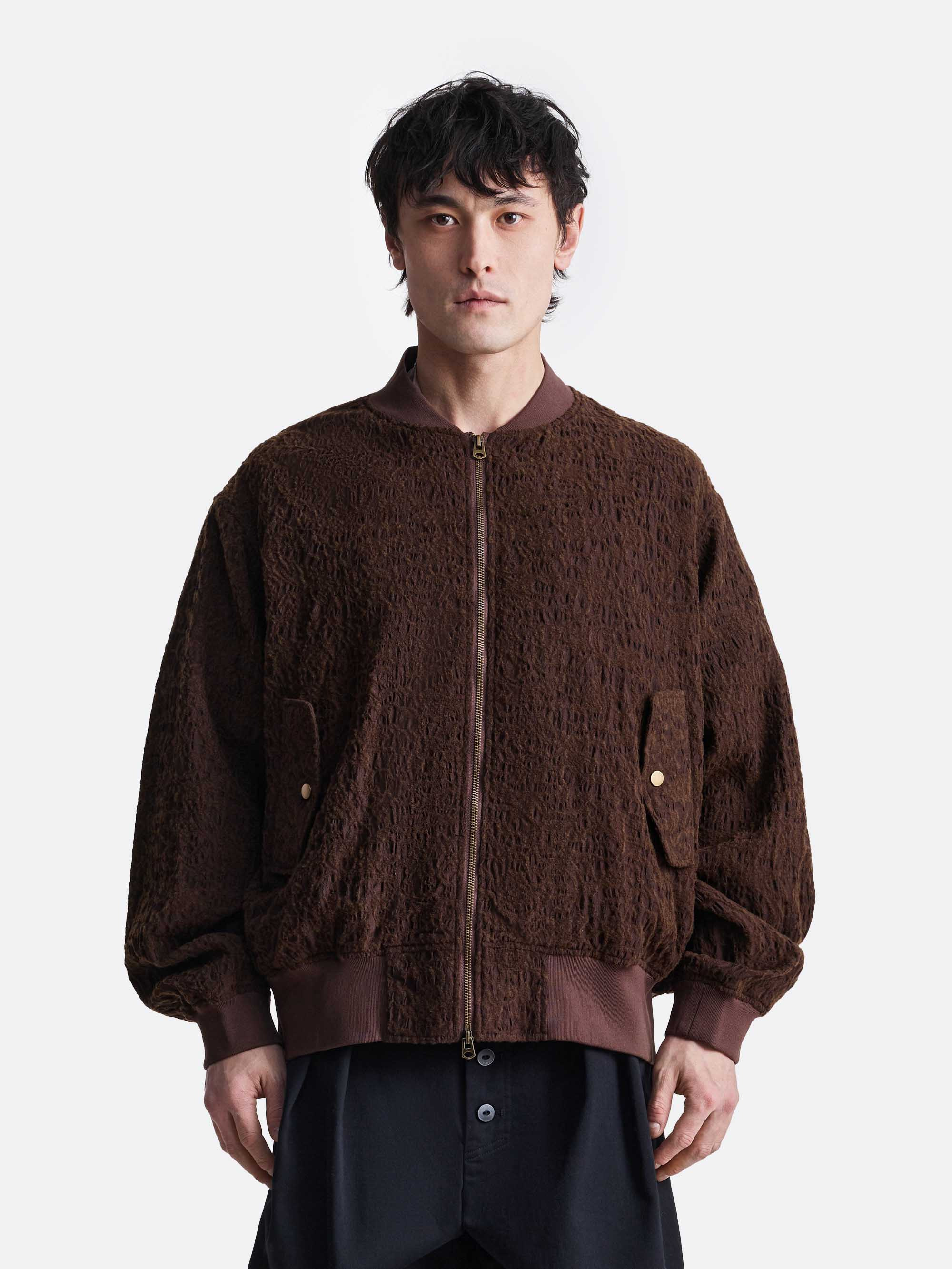 Куртка-бомбер свободного силуэта с объёмными рукавами и укороченной длиной. Модель выполнена из материала с выраженной фактурой, создающей визуальный объём и глубину цвета. Центральная застёжка на молнию дополнена эластичными манжетами и поясом. Накладные карманы с клапанами добавляют функциональный акцент и поддерживают баланс между минимализмом и выразительной текстурой.