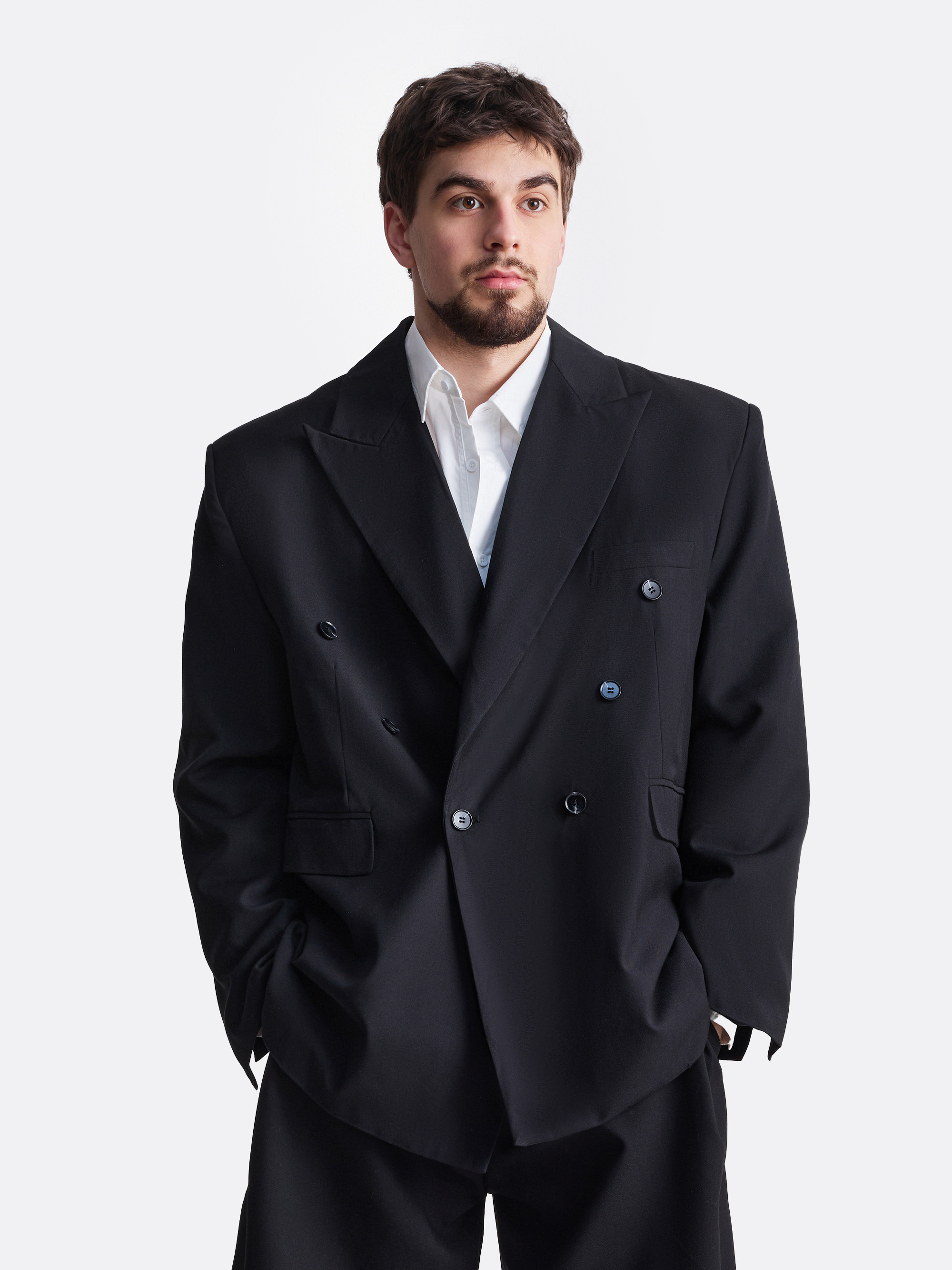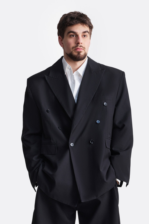 Элегантный двубортный пиджак прямого силуэта с подчёркнутой линией плеч. Модель выполнена из плотного костюмного полотна на основе хлопка, держит форму и создаёт выразительный силуэт. Контрастные пуговицы и накладные карманы добавляют современный акцент классическому крою.