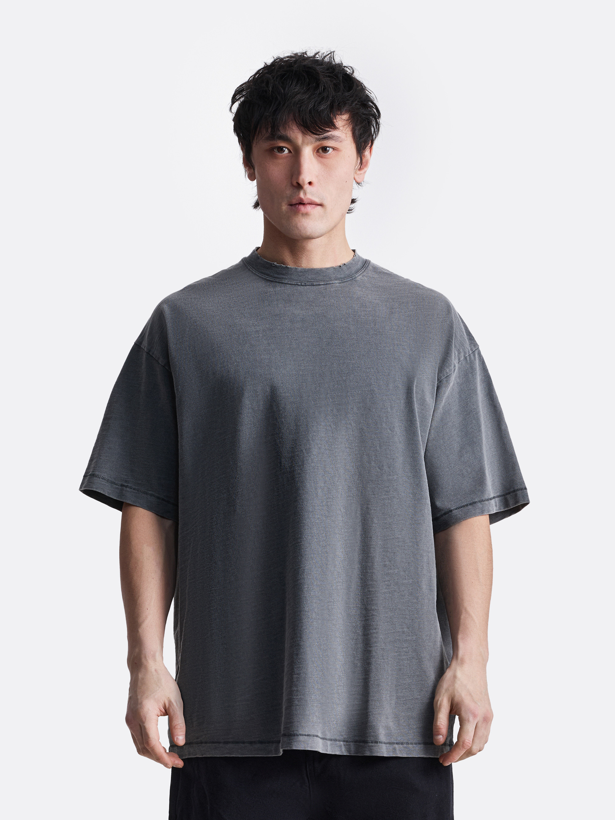 Базовая футболка свободного кроя в минималистичном дизайне. Модель выполнена из 100% хлопка, обеспечивающего комфорт и воздухопроницаемость. Спущенная линия плеч, выцветший эффект, небольшие потертости на горловине и рукавах придают современный расслабленный стиль.