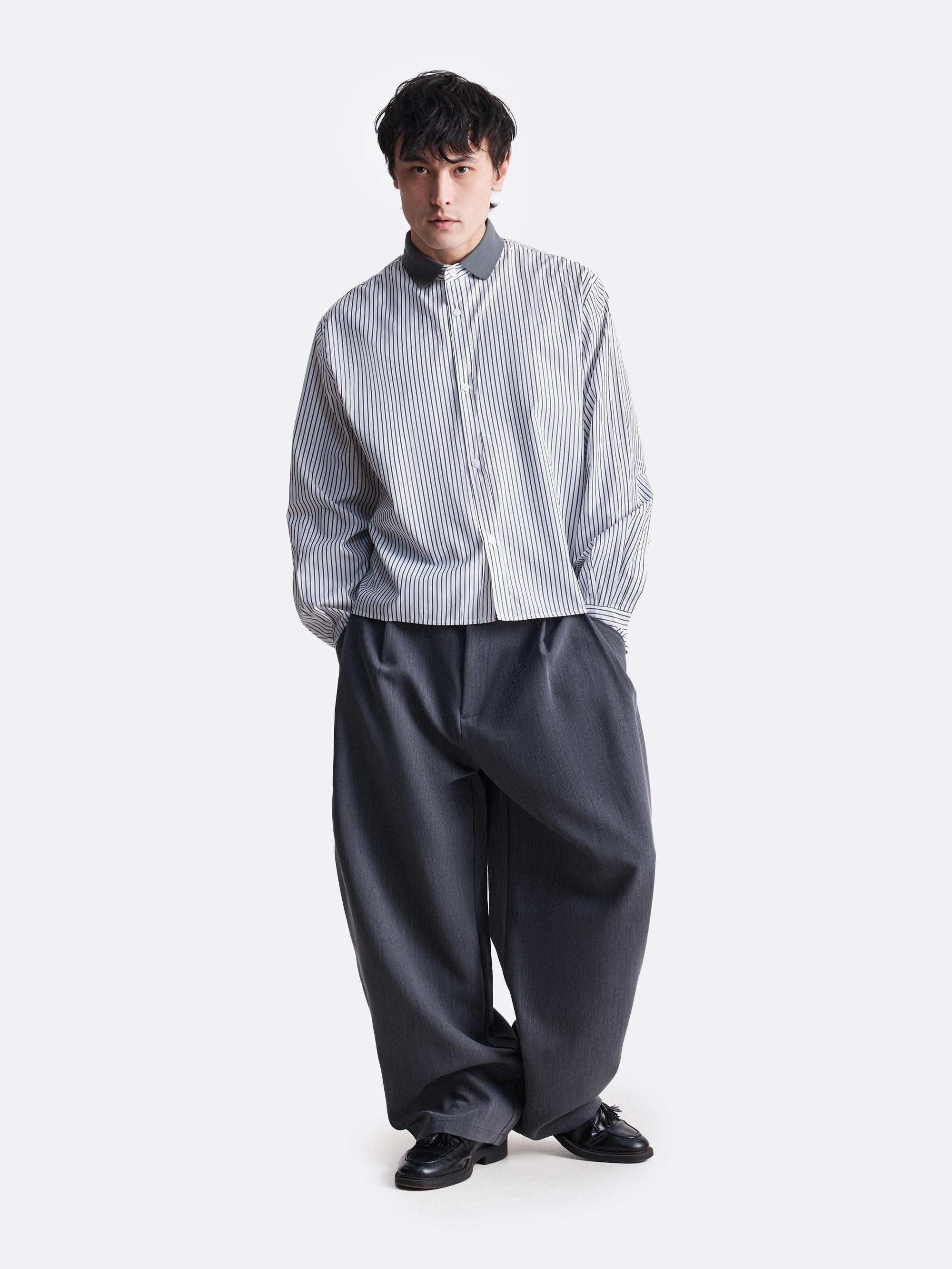 Укороченная рубашка в диагональную полоску. Модель с накладным воротником серого цвета и цельнокроеными манжетами. Удлинённый рукав и широкая кокетка на спинке добавляют ощущение расслабленного объёма. Представлена в двух цветах: серый и голубой.