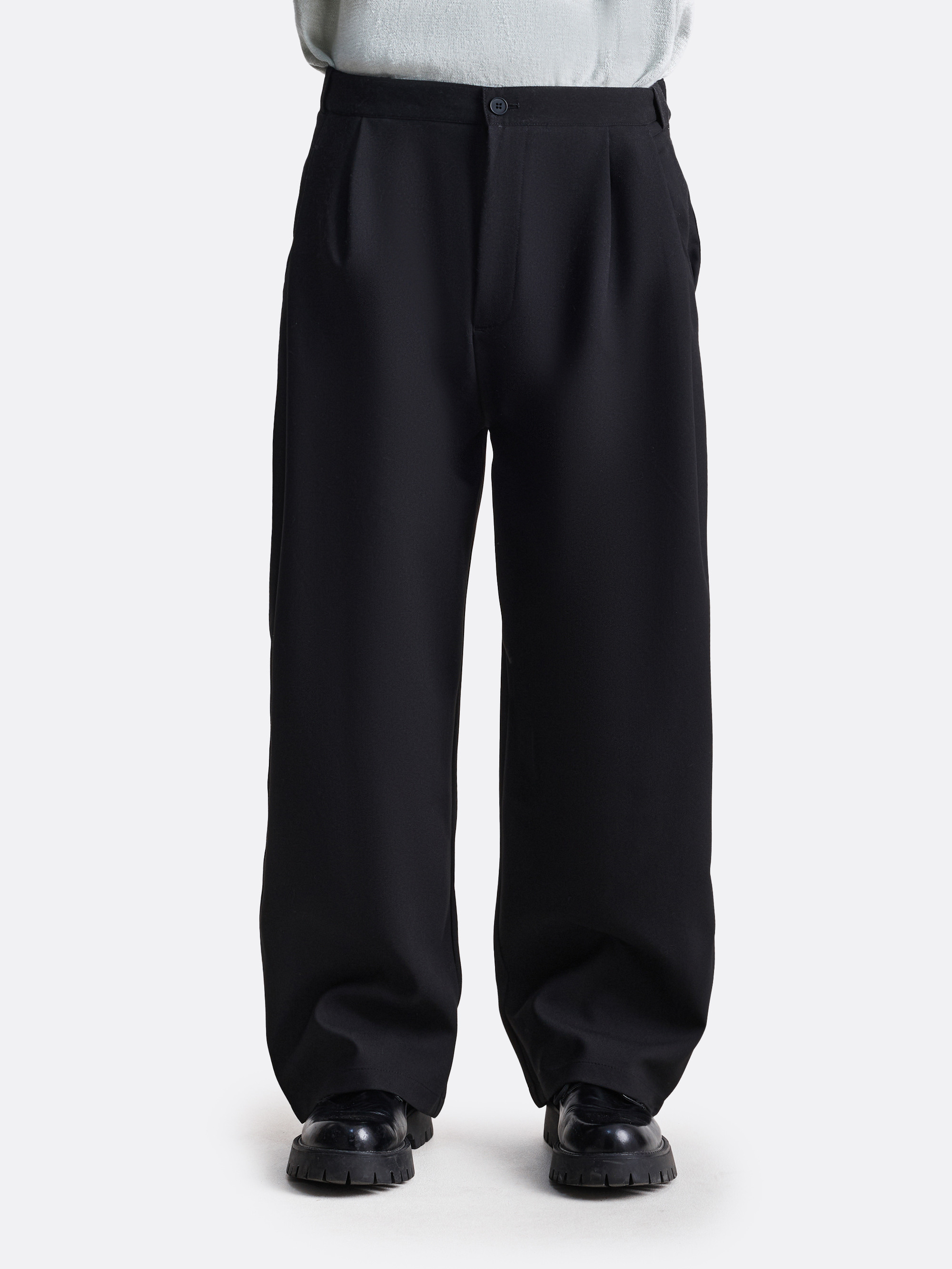 Брюки свободного силуэта с акцентом на защипы и расслабленную посадку. Глубокие складки от пояса создают выразительный объём, который усиливается за счёт плотной ткани. Слегка заниженная линия талии, классические карманы и универсальная длина — модель, в которой формальность легко сочетается с комфортом.