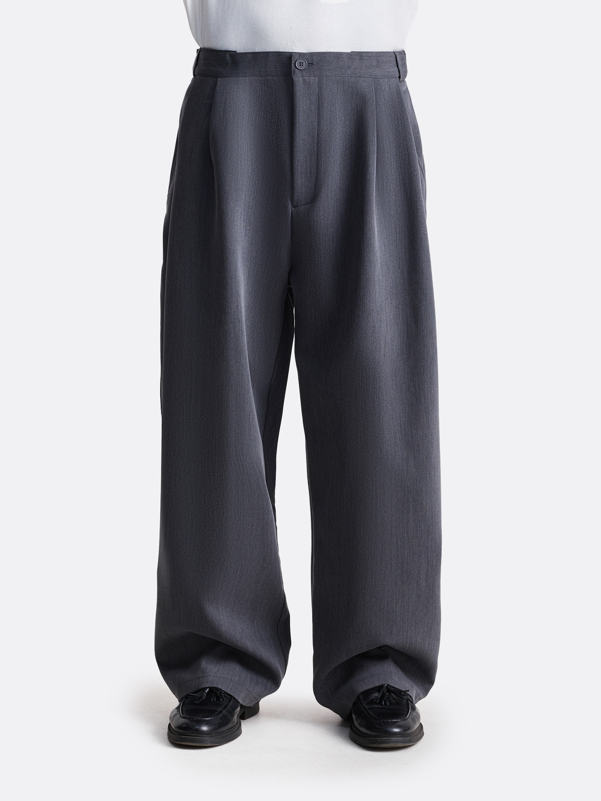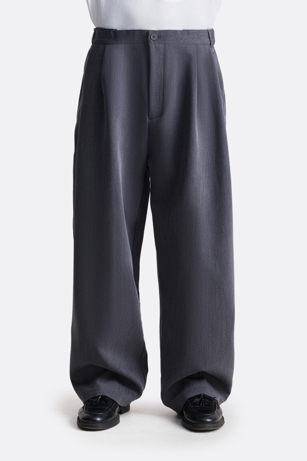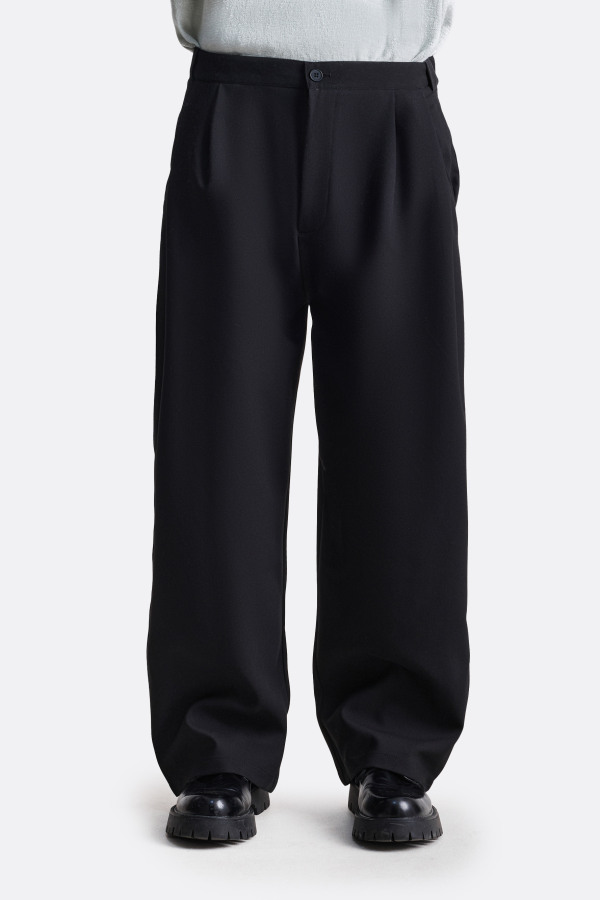 Брюки свободного силуэта с акцентом на защипы и расслабленную посадку. Глубокие складки от пояса создают выразительный объём, который усиливается за счёт плотной ткани. Слегка заниженная линия талии, классические карманы и универсальная длина — модель, в которой формальность легко сочетается с комфортом.