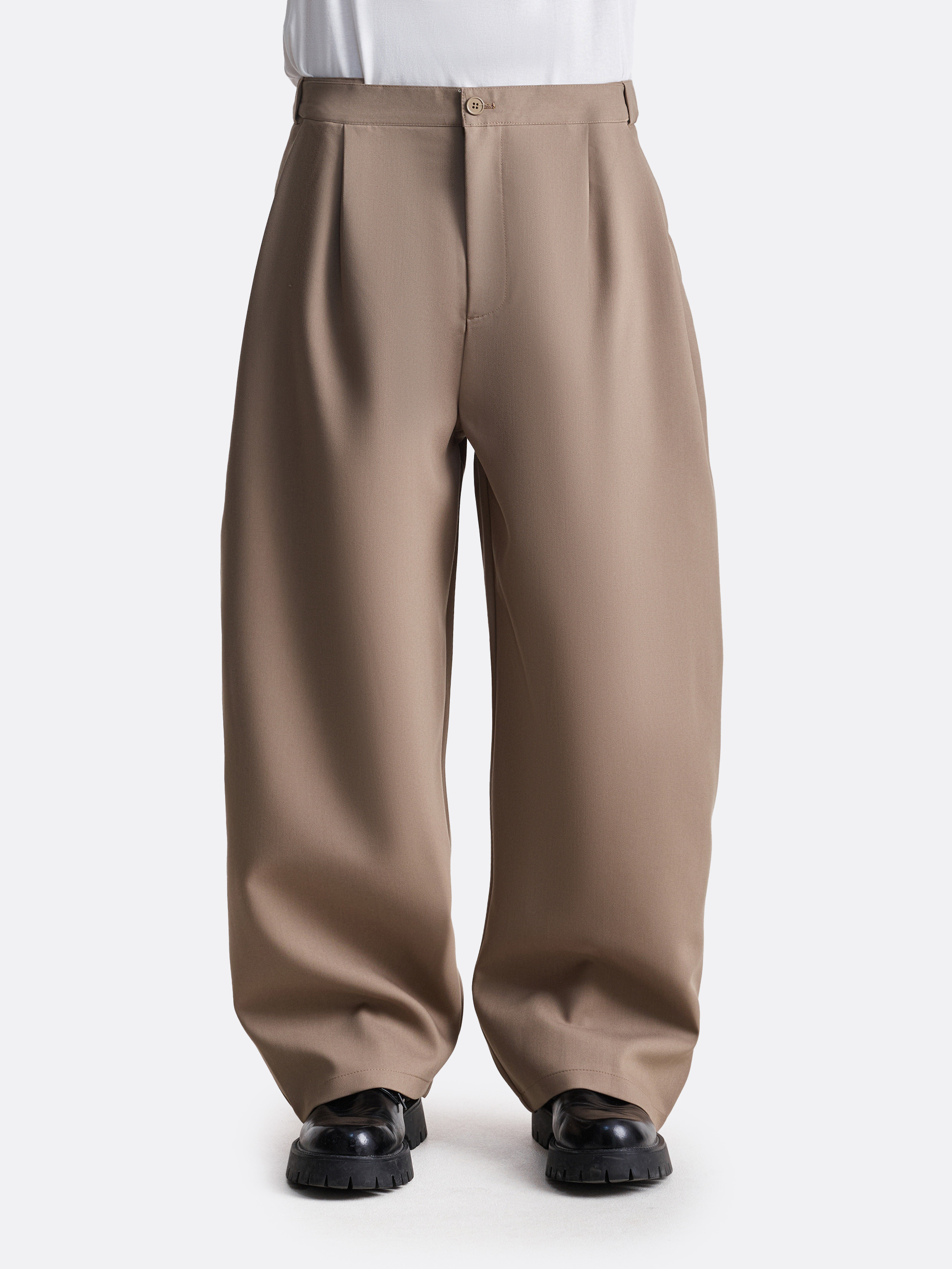 Брюки свободного силуэта с акцентом на защипы и расслабленную посадку. Глубокие складки от пояса создают выразительный объём, который усиливается за счёт плотной ткани. Слегка заниженная линия талии, классические карманы и универсальная длина — модель, в которой формальность легко сочетается с комфортом.