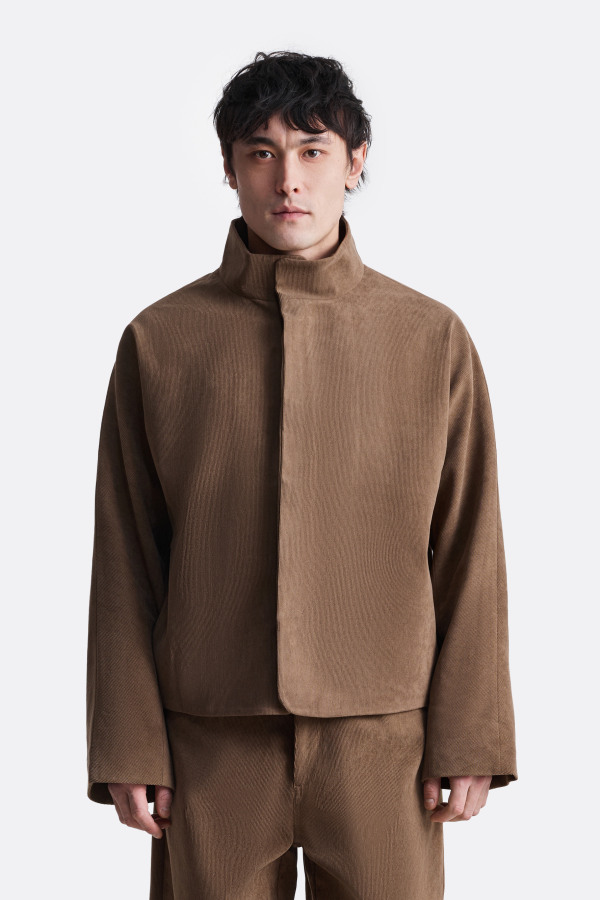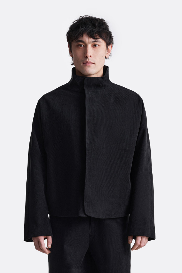 Куртка из вельвета с высоким воротником-стойкой. Куртка имеет свободный крой, слегка укороченный силуэт и длинные рукава. Модель застегивается на скрытую молнию. Общий стиль куртки можно охарактеризовать как повседневный и комфортный, подходящий для прохладной погоды. Представлена в бежевом и черном цветах.