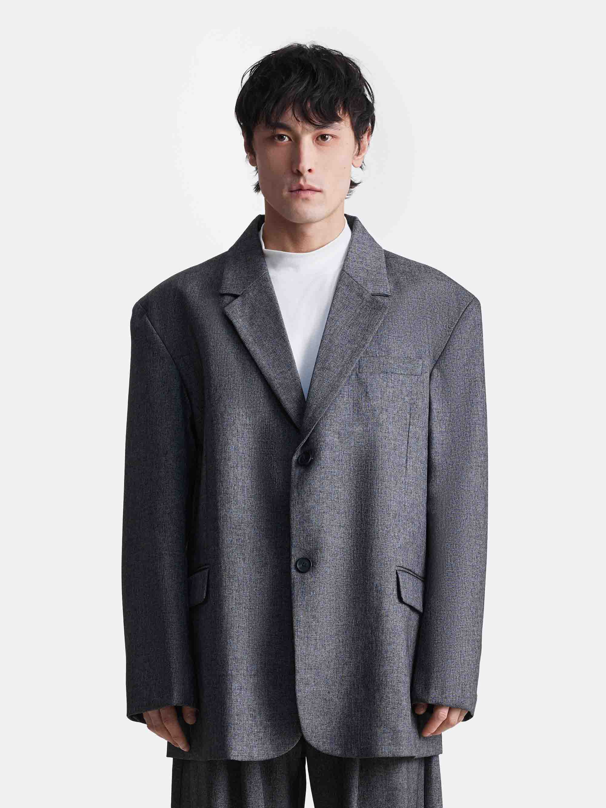 Однобортный пиджак удлинённого силуэта с чёткой линией плеч и классическими лацканами. Застёжка на пуговицы формирует аккуратный вертикальный акцент, спереди расположены прорезные карманы с клапанами и нагрудный карман.