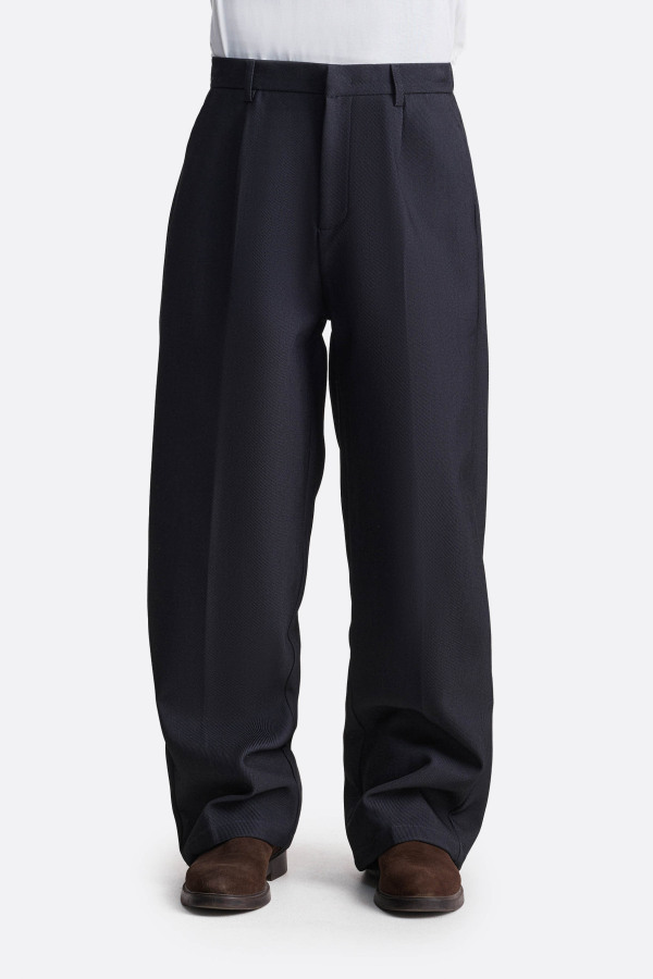 Брюки свободного силуэта с широкими прямыми штанинами и мягкой посадкой по талии. Передние защипы формируют дополнительный объём и подчёркивают вертикаль силуэта. Пояс со шлёвками фиксируется на застёжку, сохраняя аккуратную линию верха.