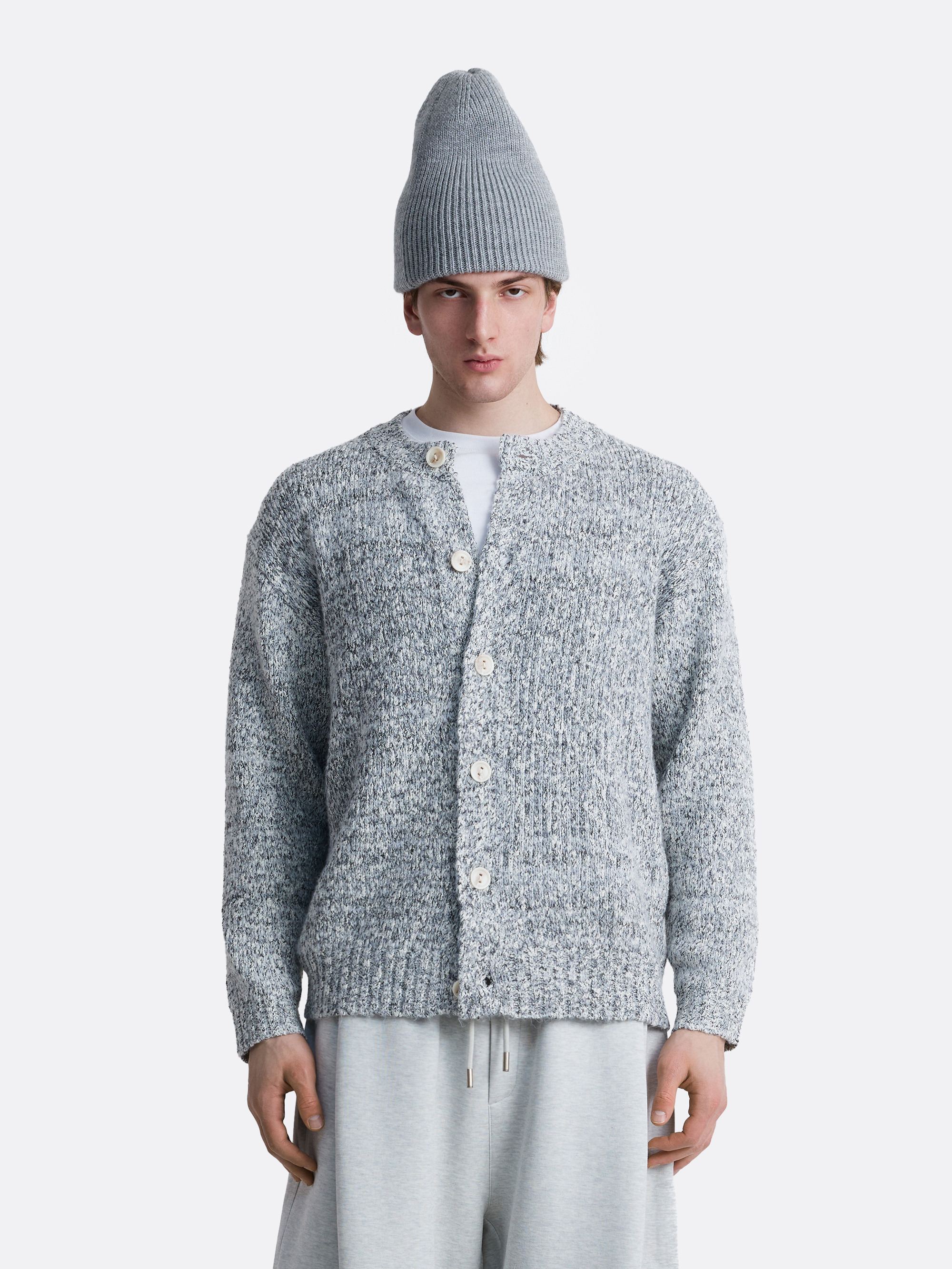 Вязаный кардиган мягкого со слегка рыхлой, «облачной» фактурой, создающей ощущение невесомости и комфорта. Свободный силуэт, крупные светлые пуговицы и уплотнённая резинка по краю добавляют аккуратную структуру, не забирая у вещи её расслабленного характера. Тактильно объёмный и уютный, легко вписывающийся в повседневные образы, привнося в них лёгкость.