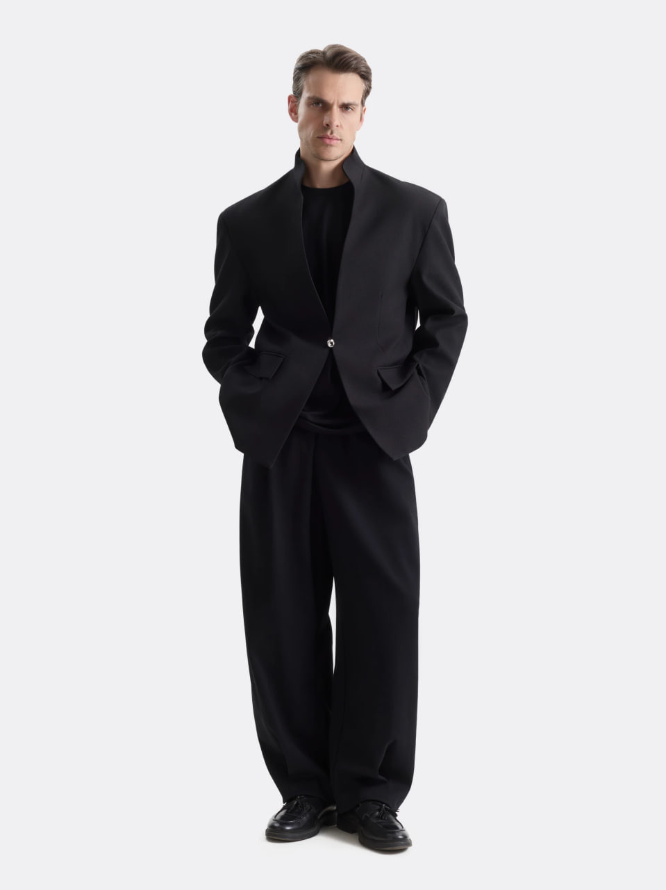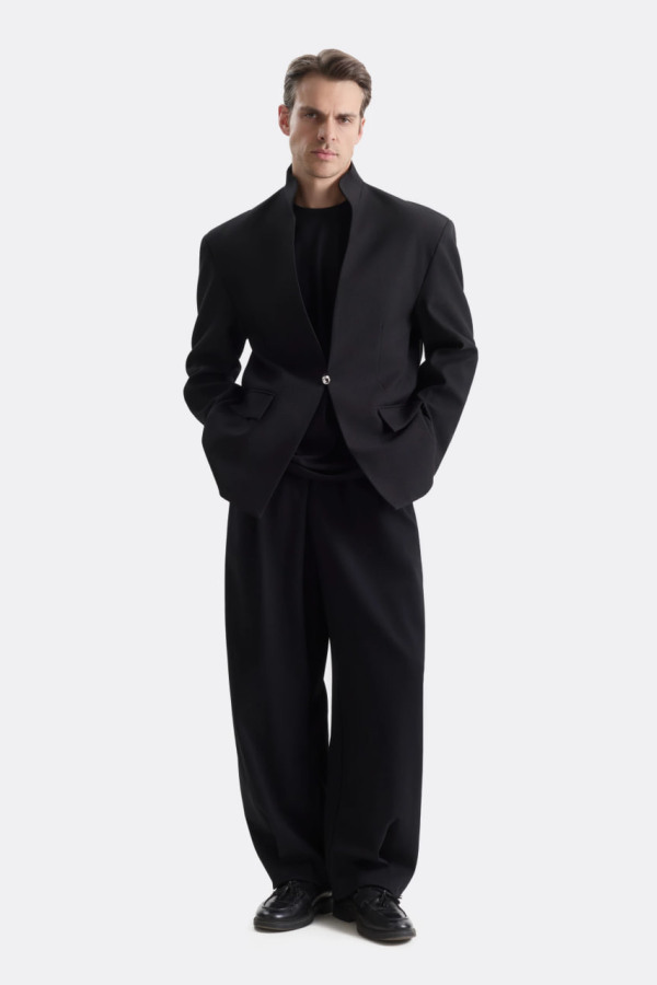 Пиджак строгого силуэта с выразительным воротником-стойкой и застёжкой на одну пуговицу. Эстетика минимализма дополнена двумя прорезными клапанами спереди — без привычных лацканов, но с чёткой архитектурой линий.