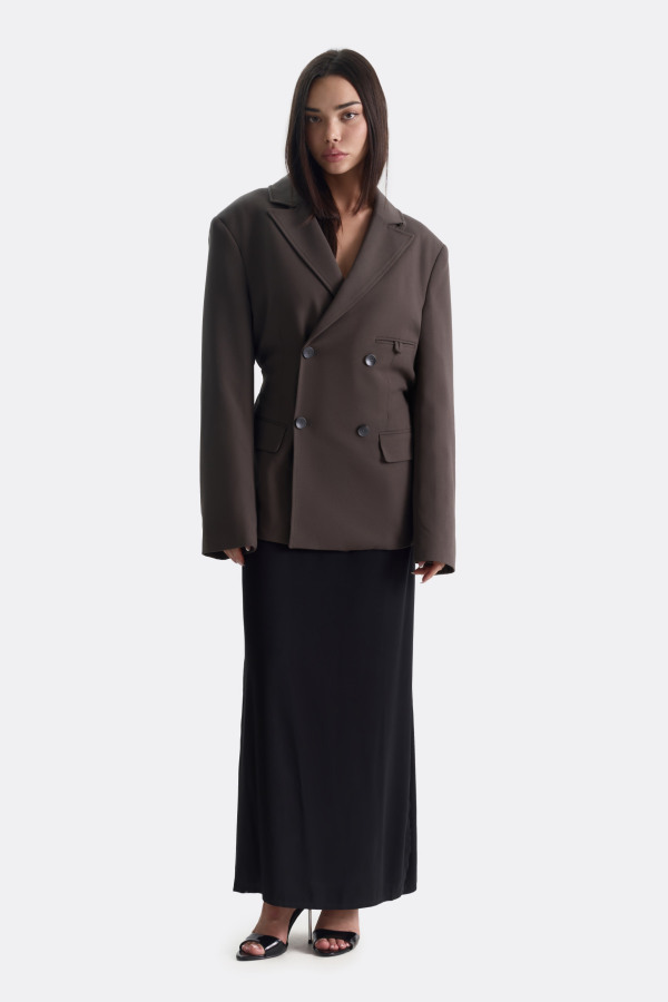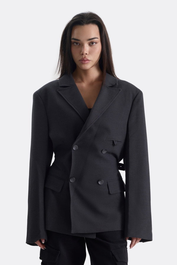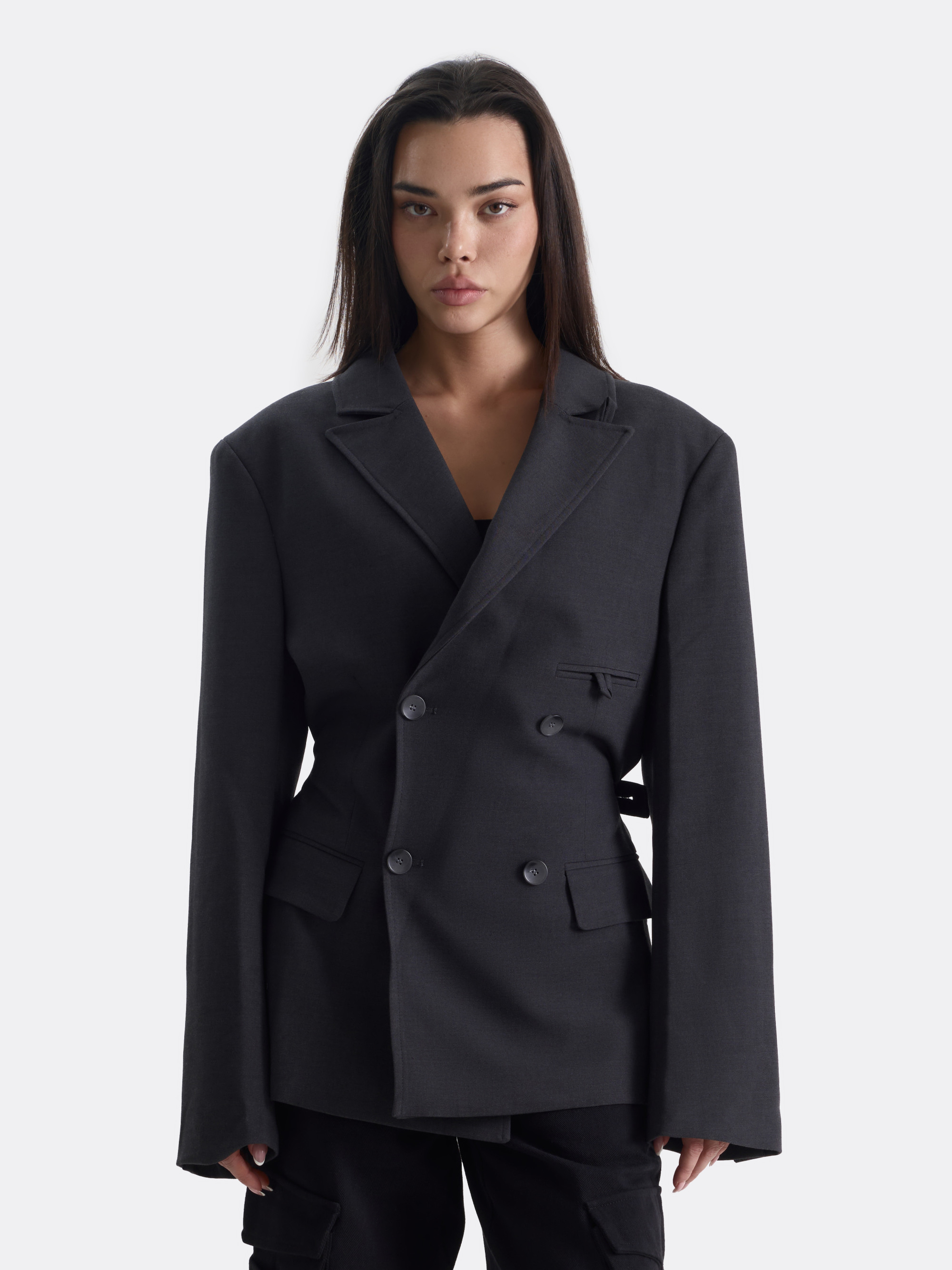 Двубортный пиджак с прямыми линиями и акцентированной регулируемой талией. Строгие лацканы, прорезной нагрудный карман и два клапанных кармана создают строгий силуэт с характером. Четкая посадка сочетается с легкой мягкостью ткани, а выразительные пуговицы придают образу графичности.