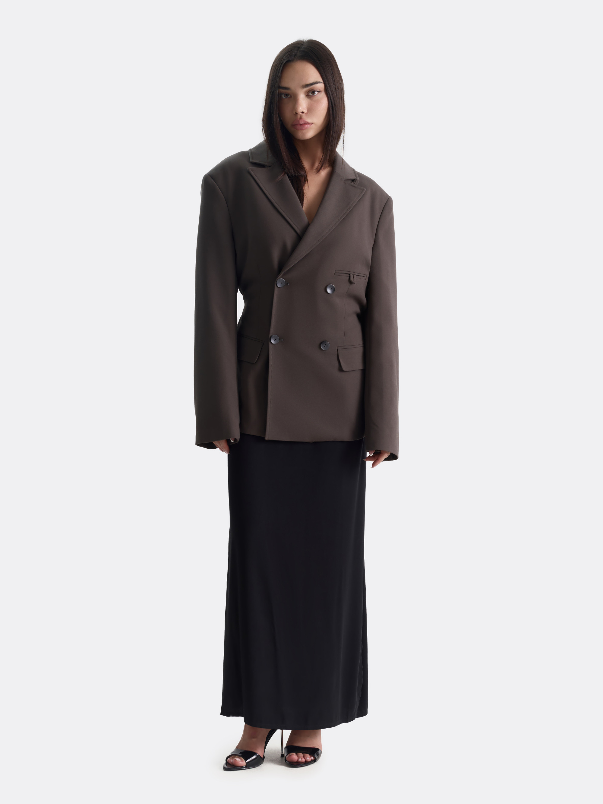 Классический двубортный пиджак с прямыми линиями и акцентированной регулируемой талией. Строгие лацканы, прорезной нагрудный карман и два клапанных кармана создают строгий силуэт с характером. Четкая посадка сочетается с легкой мягкостью ткани, а выразительные пуговицы придают образу графичности.